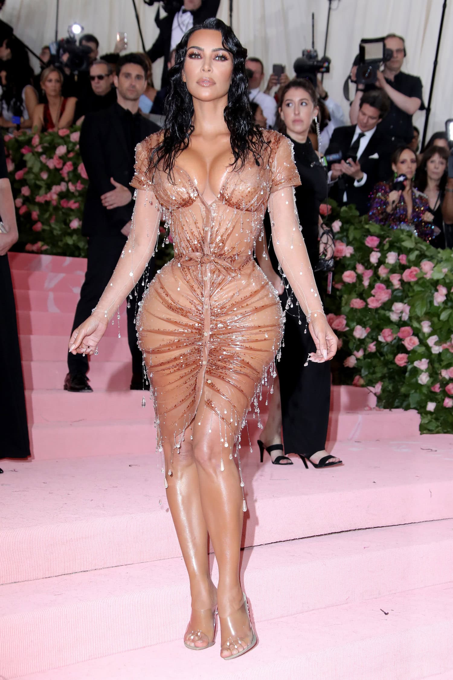 Kim tunnetaan lateksimekoistaan. Nudensävyinen mekko on yksi Kimin ikonisimmista asuista.
