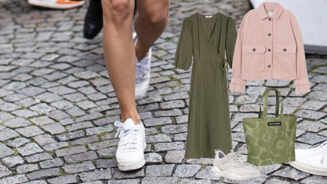 Tennarit antavat raikkaan ilmeen myös juhlavammankin kesämekon parina. Jatka syksyn tullen suosikkimekkosi käyttöä yhdistämällä se muhkeaan neuleeseen tai takkiin.
