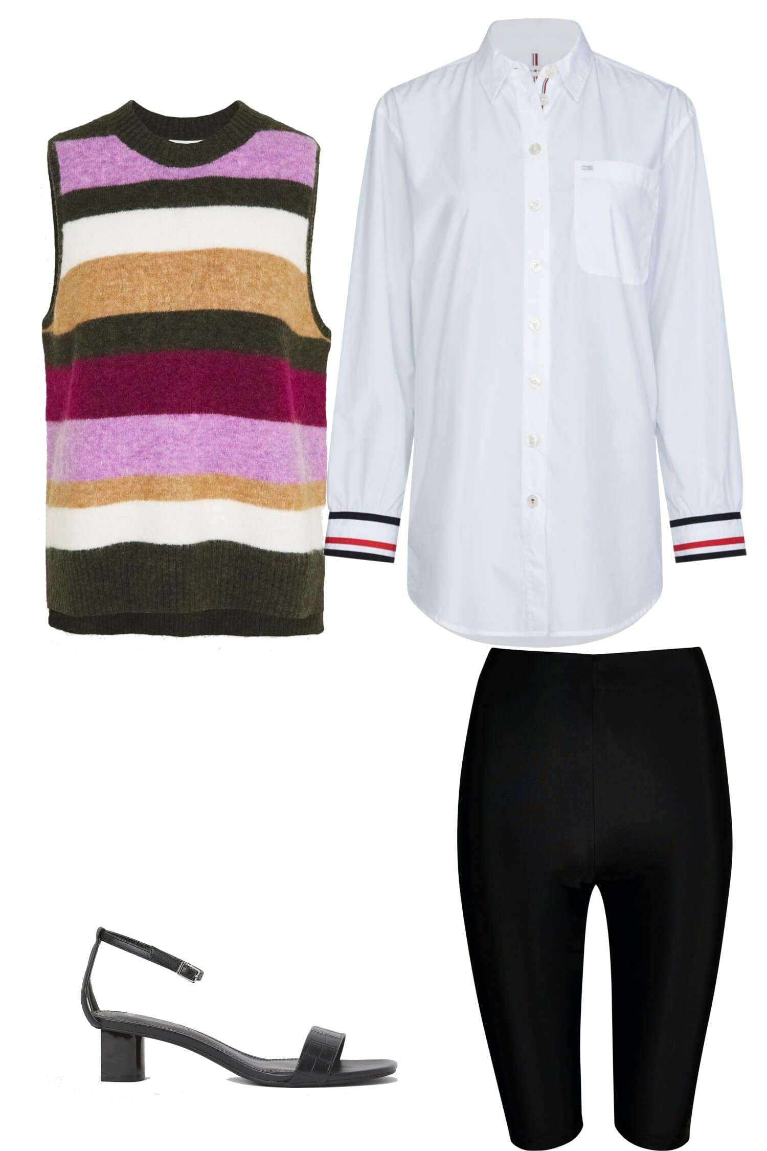 Ennakkoluuloton pukee kaksi haastavana pidettyä trendiä yhteen. Pyöräilyshortsit saavat kiinnostavan yläosan klassisesta kauluspaidasta ja skarpista neuleliivistä.