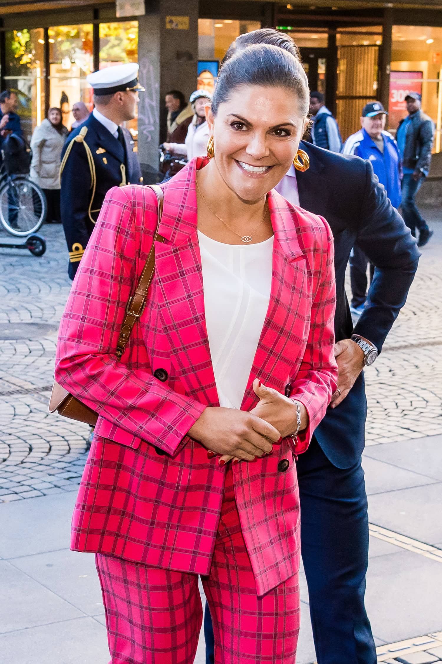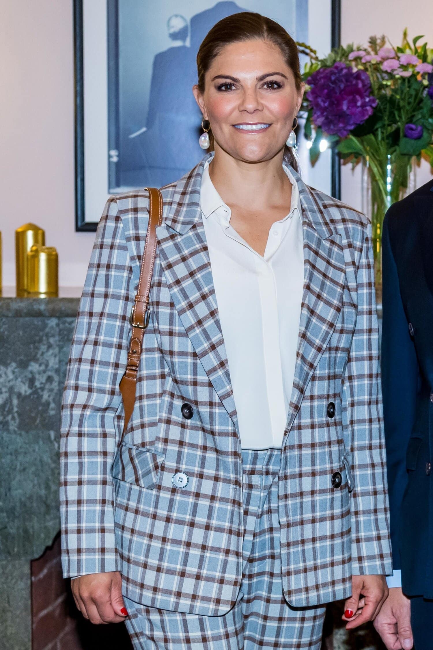 Kruununprinsessan tavaramerkki ovat kauniisti laskeutuvat mekot, mutta viime aikoina hänen tyylissään on toistunut trendikäs housupuku. Bleiserit ovat tämän syksyn hitti ja muotiväki yhdistääkin niitä enimmäkseen mätsäävien housujen pariksi. Victorian housupukutyyleissä on näkynyt myös toinen ajankohtainen trendi: ruudut.