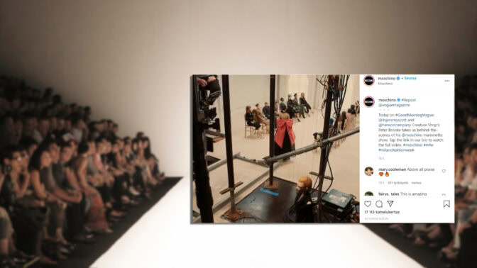 Brändin näytöksessä mallit eivät sinkoilleet backstagella sumpussa, eivätkä kutsuvieraat istuneet kylki kyljessä penkkiriveillä. Sen sijaan Moschinon kevään 2021 malliston esittelivät marionettinuket. Eturivissä istui niin ikään puisia katsojia. Yleisöstä saattoi bongata muun muassa Voguen päätoimittajana tunnetun Anna Wintourin tai muotiguru Edward Enninfulin.