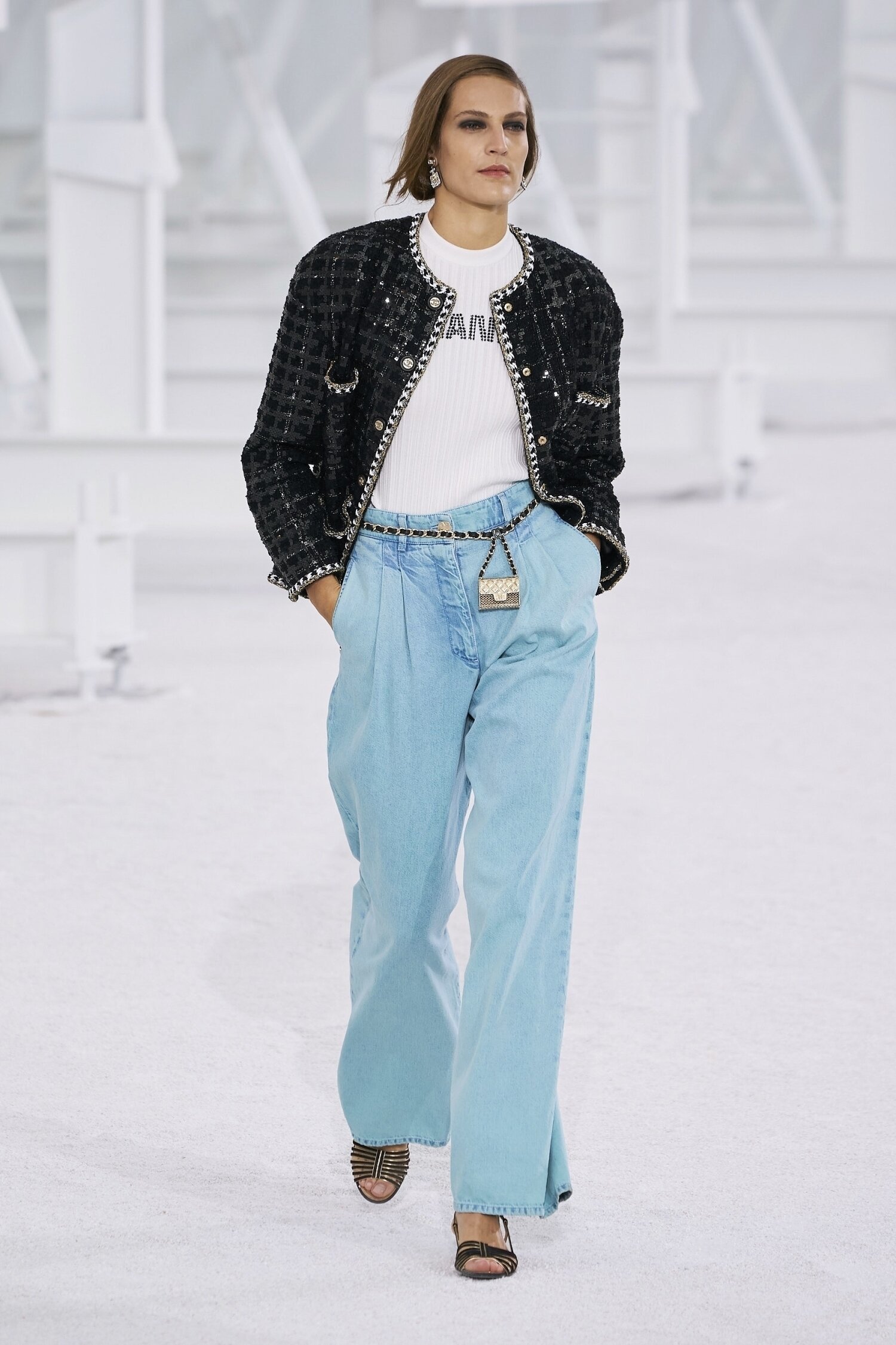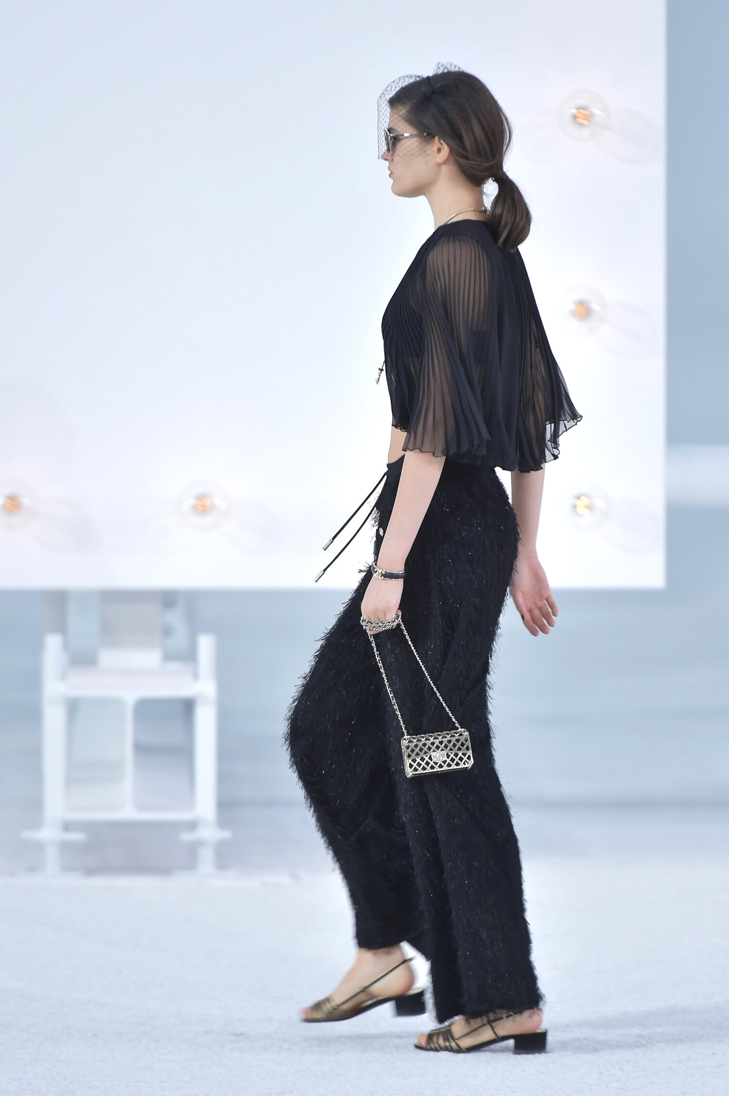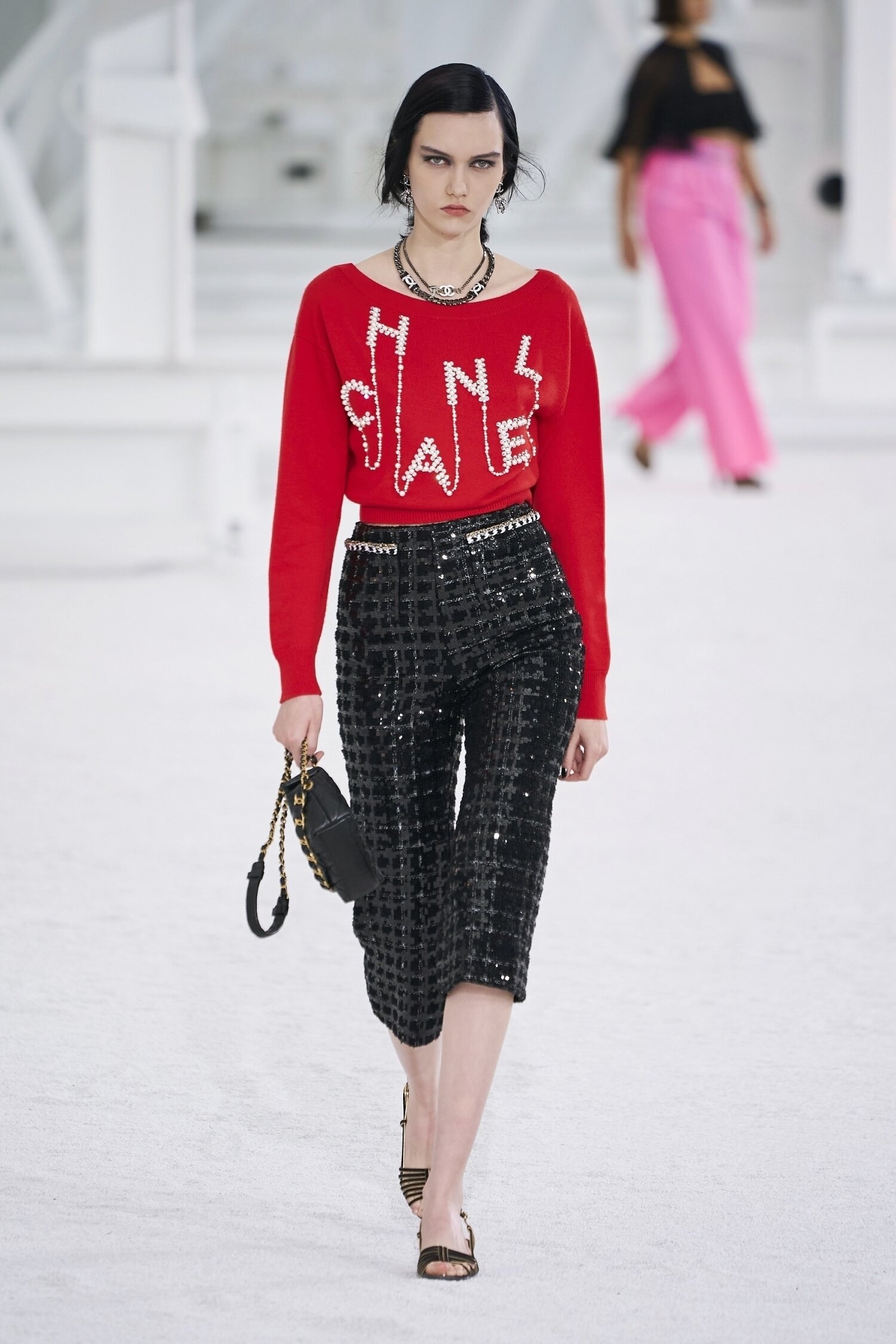 Näytöksessä nähtiin muun muassa 80-lukua henkiviä Chanel-pukutakkeja, jotka näyttävät vuonna 2020 ajankohtaisilta väljiin farkkuihin yhdistettyinä. Skarppien chanelmaisten takkien, housujen ja hameiden lisäksi mallistoon kontrastia toivat muun muassa neonväriset printit. Ennen kaikkea mallistossa riitti metallinhohtoja, helmiä ja strasseja. Helmiä nähtiin niin neulepaidoissa, hiuspannoissa, koruissa kuin vöissäkin. Metallisävyistä hopea on ajankohtaisin valinta.