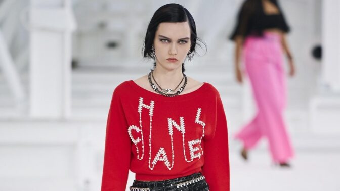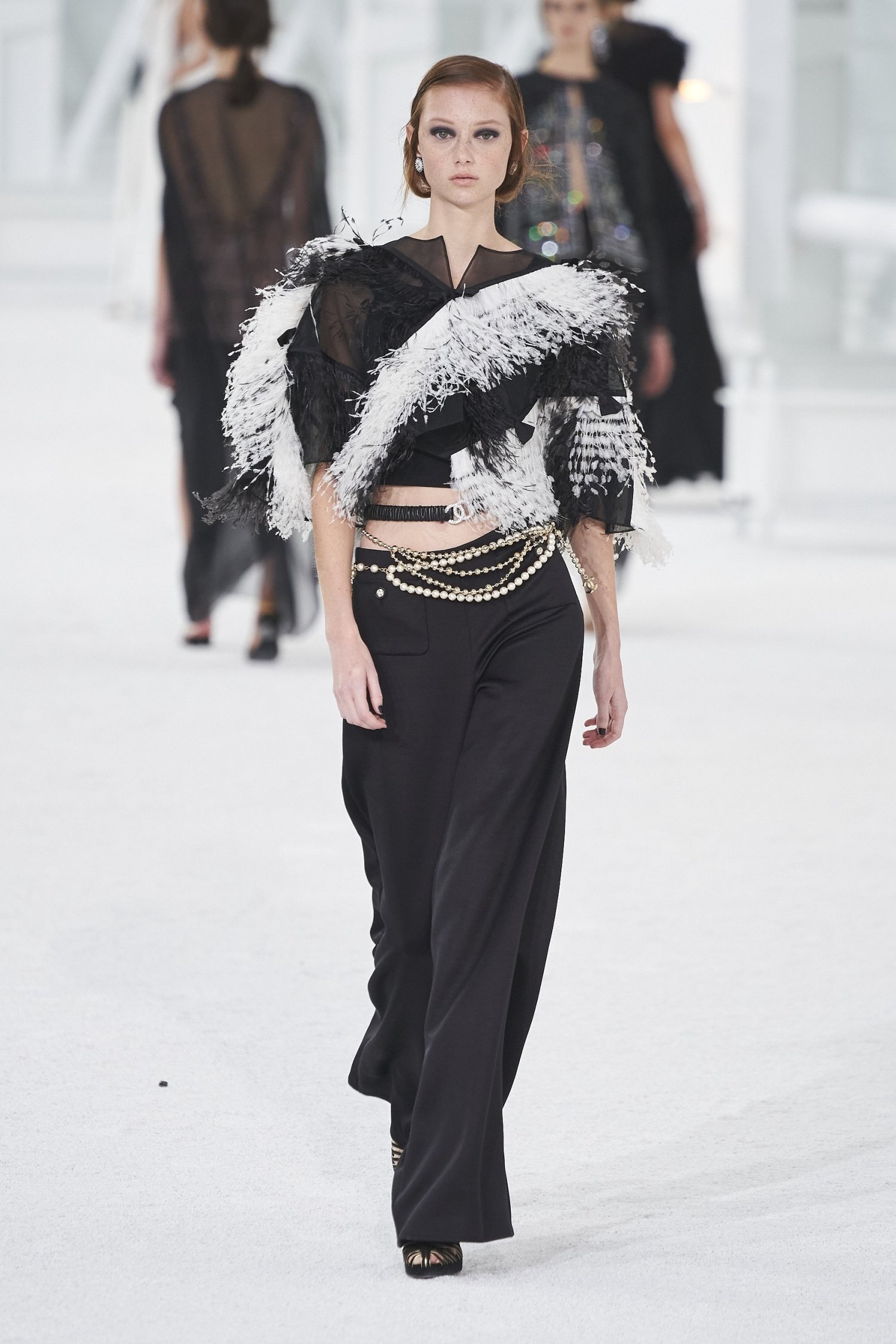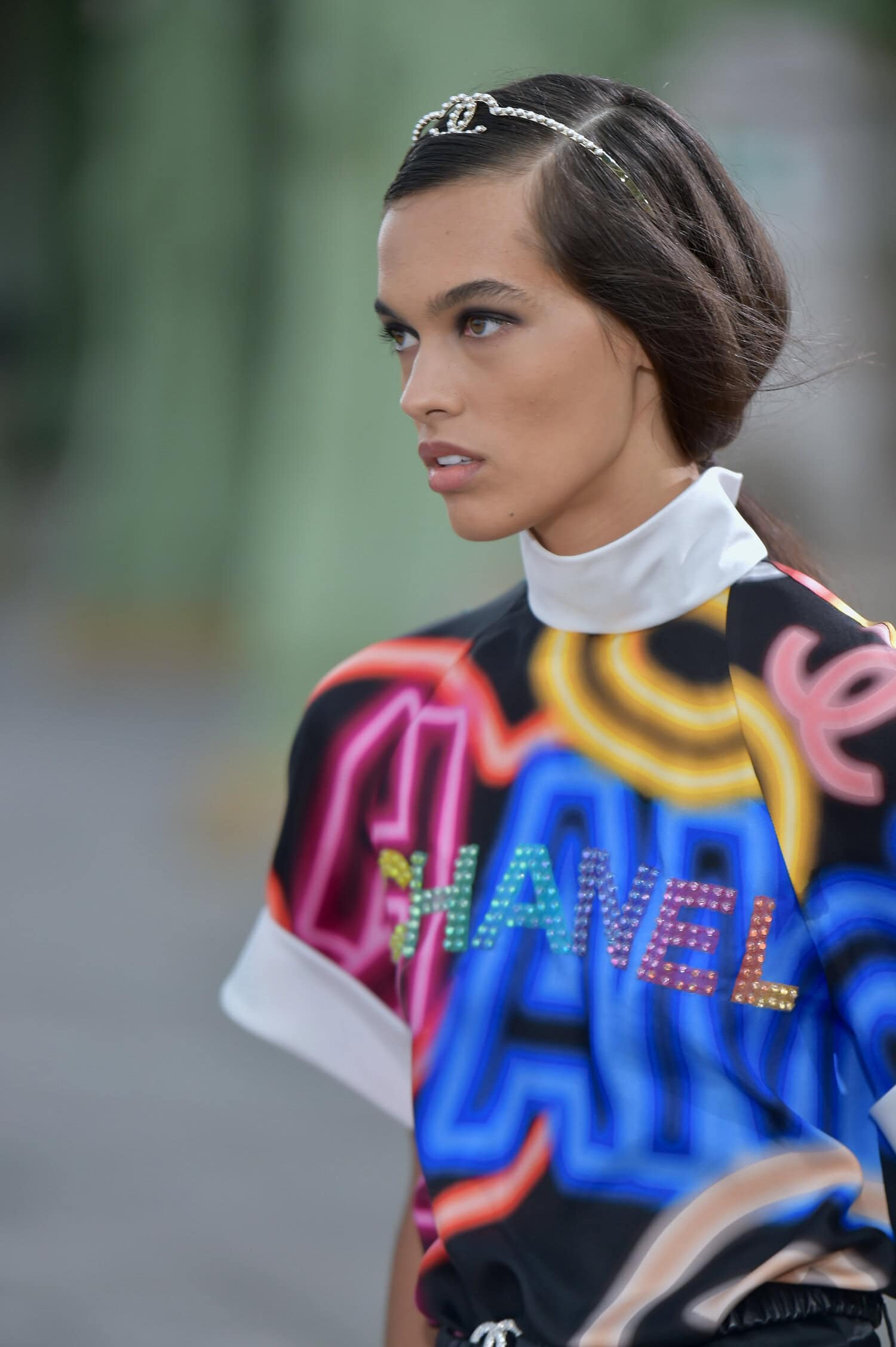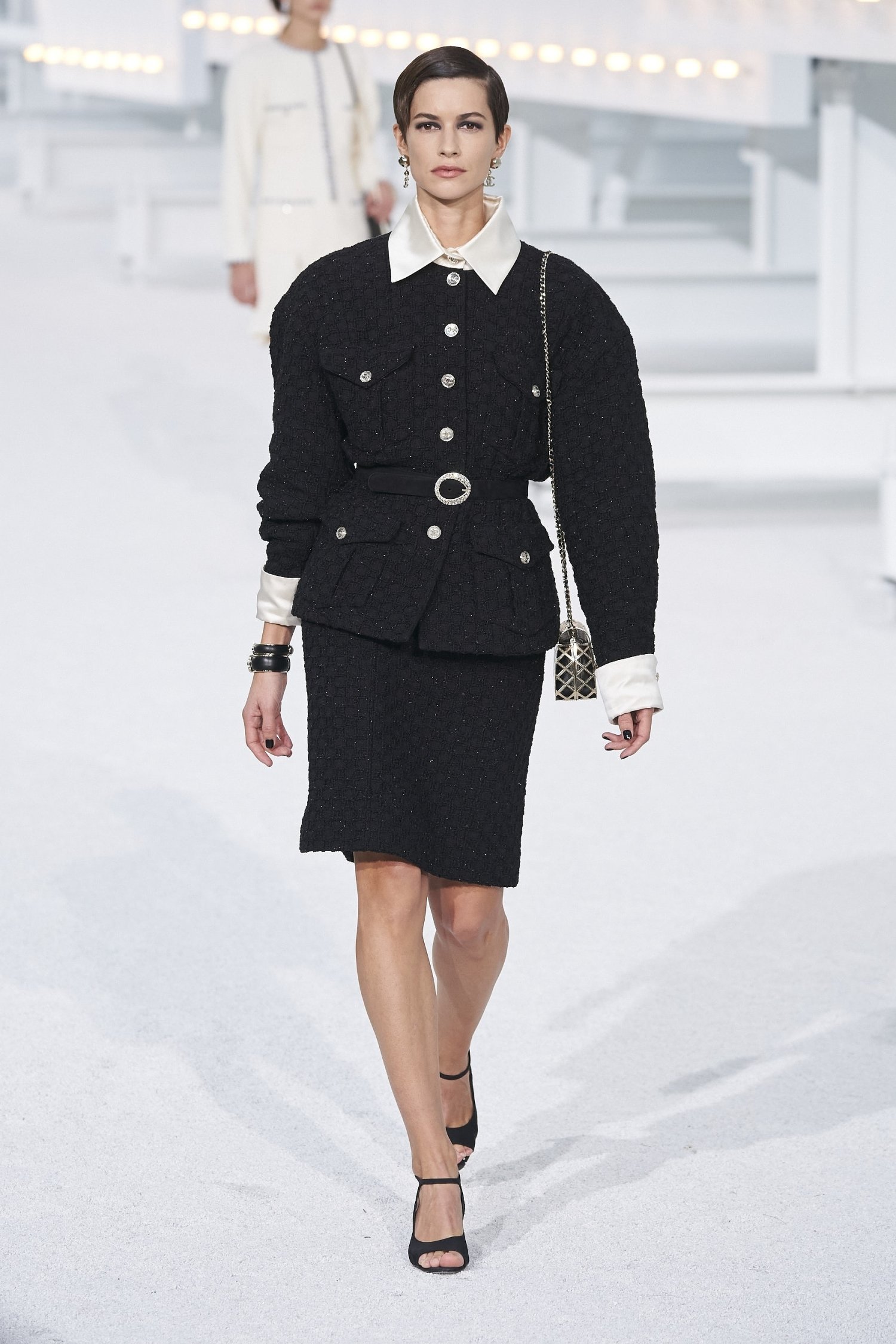 Näytöksessä nähtiin muun muassa 80-lukua henkiviä Chanel-pukutakkeja, jotka näyttävät vuonna 2020 ajankohtaisilta väljiin farkkuihin yhdistettyinä. Skarppien chanelmaisten takkien, housujen ja hameiden lisäksi mallistoon kontrastia toivat muun muassa neonväriset printit. Ennen kaikkea mallistossa riitti metallinhohtoja, helmiä ja strasseja. Helmiä nähtiin niin neulepaidoissa, hiuspannoissa, koruissa kuin vöissäkin. Metallisävyistä hopea on ajankohtaisin valinta.