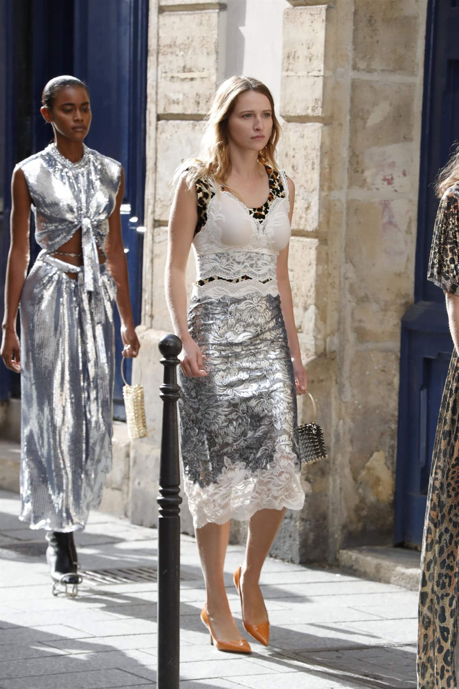 Hopea ja kimaltavat yksityiskohdat rytmittävät kevään muotimallistoja. Hopea kimmelsi muun muassa Paco Rabannen (kuvassa), Balmainin, Balenciagan ja Burberryn näytöslavoilla. Metallisävyt näkyvät vahvasti ensi vuonna.