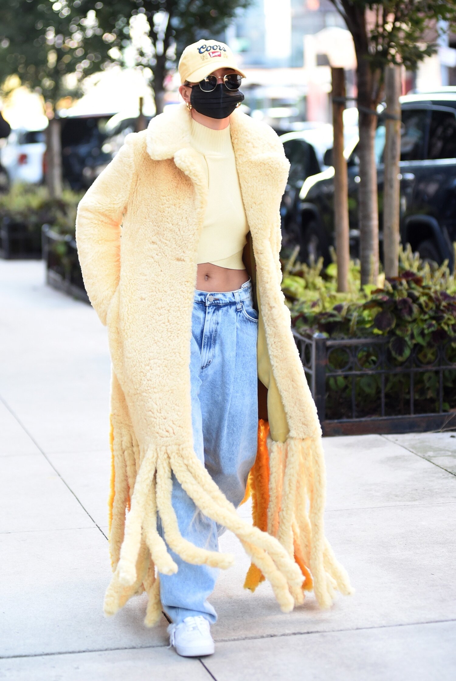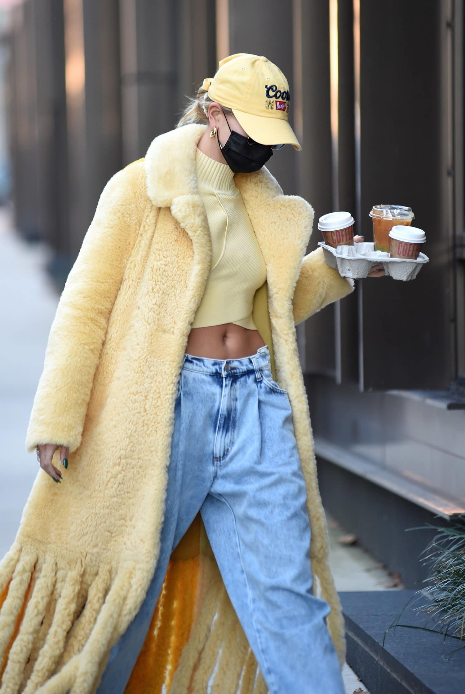 Bieber kuvattiin hiljattain New Yorkissa samanlaisessa takissa. Bieber oli yhdistänyt pastellinkeltaiseen takkiin samansävyisen lippiksen sekä napapaidan. Rennot farkut ja klassiset valkoiset tennarit toimivat mutkattomasti tässäkin tyylissä.