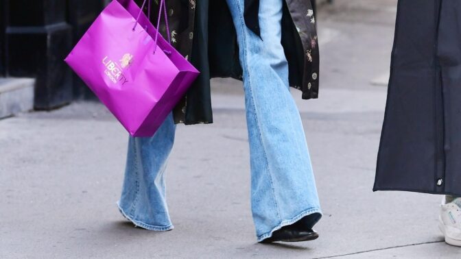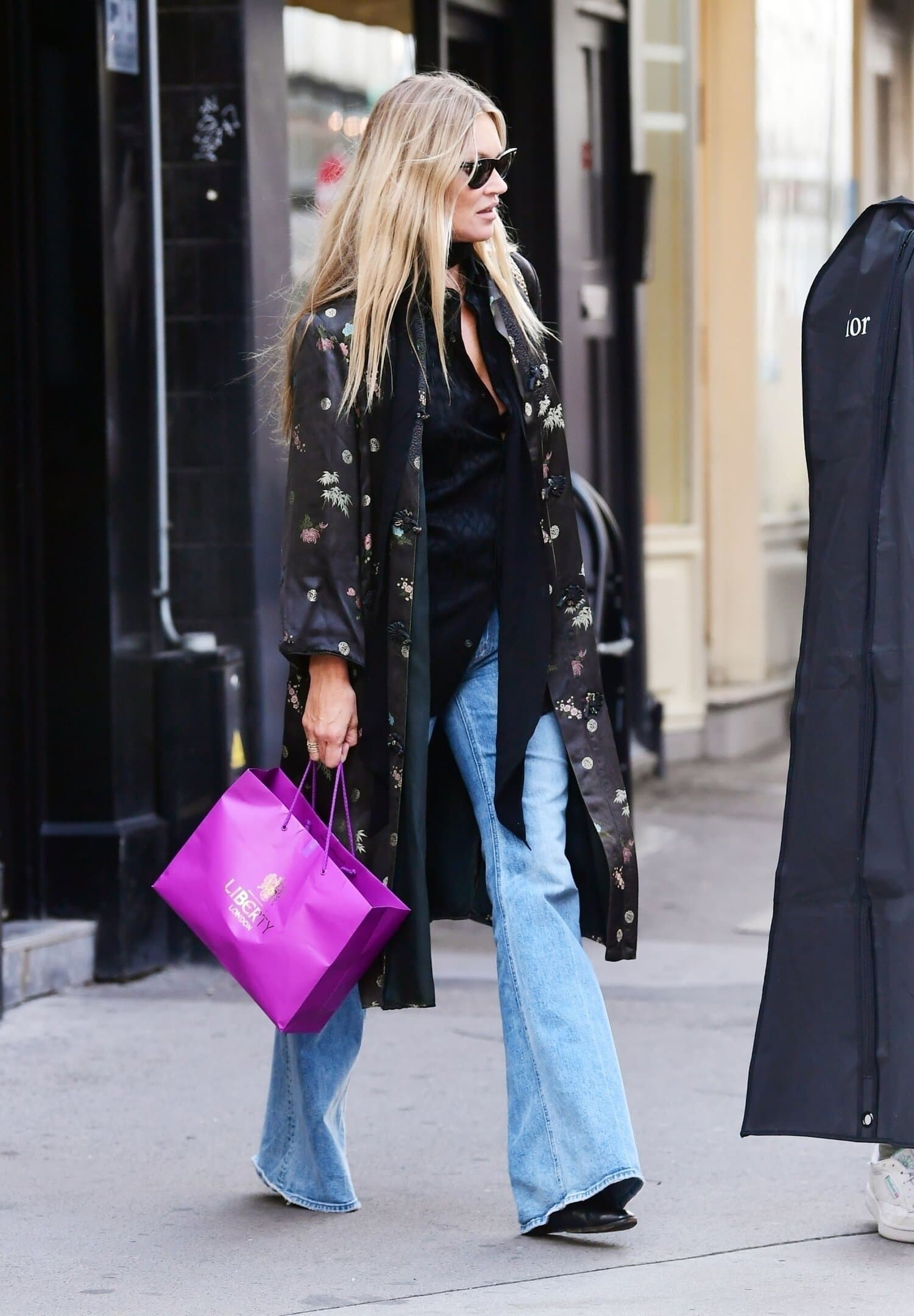 Malli Kate Moss esittelee syksyn trendityylin. Kauden muodikkaimmissa farkuissa on leveät lahkeet. Yhdistä maata viiltäviin liehulahkeisiin kapeakärkiset korkokengät.