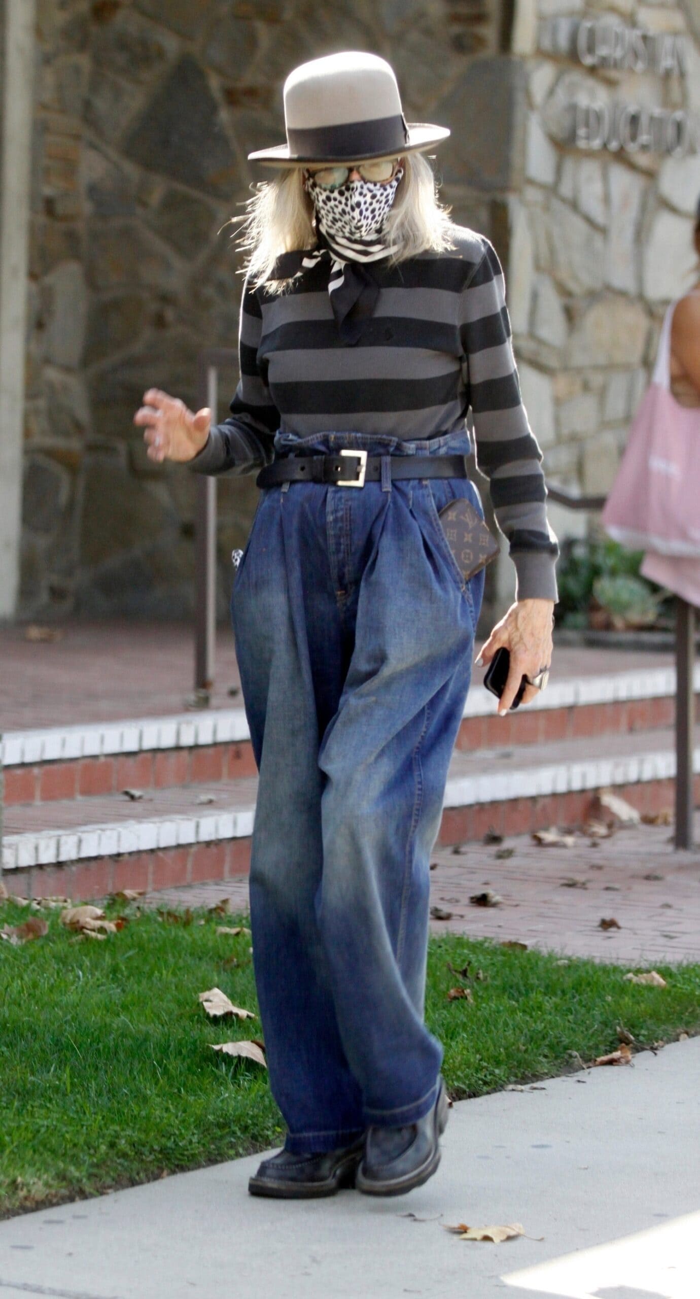 Diane Keaton kuroi väljät farkut vyötärölle näyttävällä vyöllä.