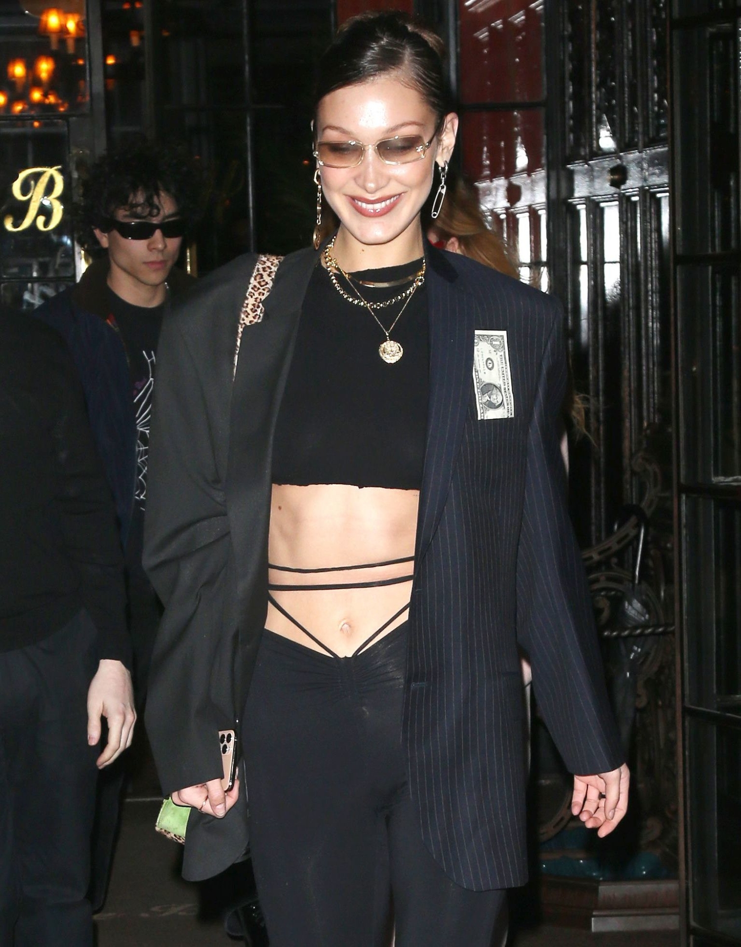 Hadid rakastaa nahkaisia vaatteita. Tähden illallisasussa oli Western-henkeä ruutupaitoineen, nahkaliiveineen ja solkihousuineen.