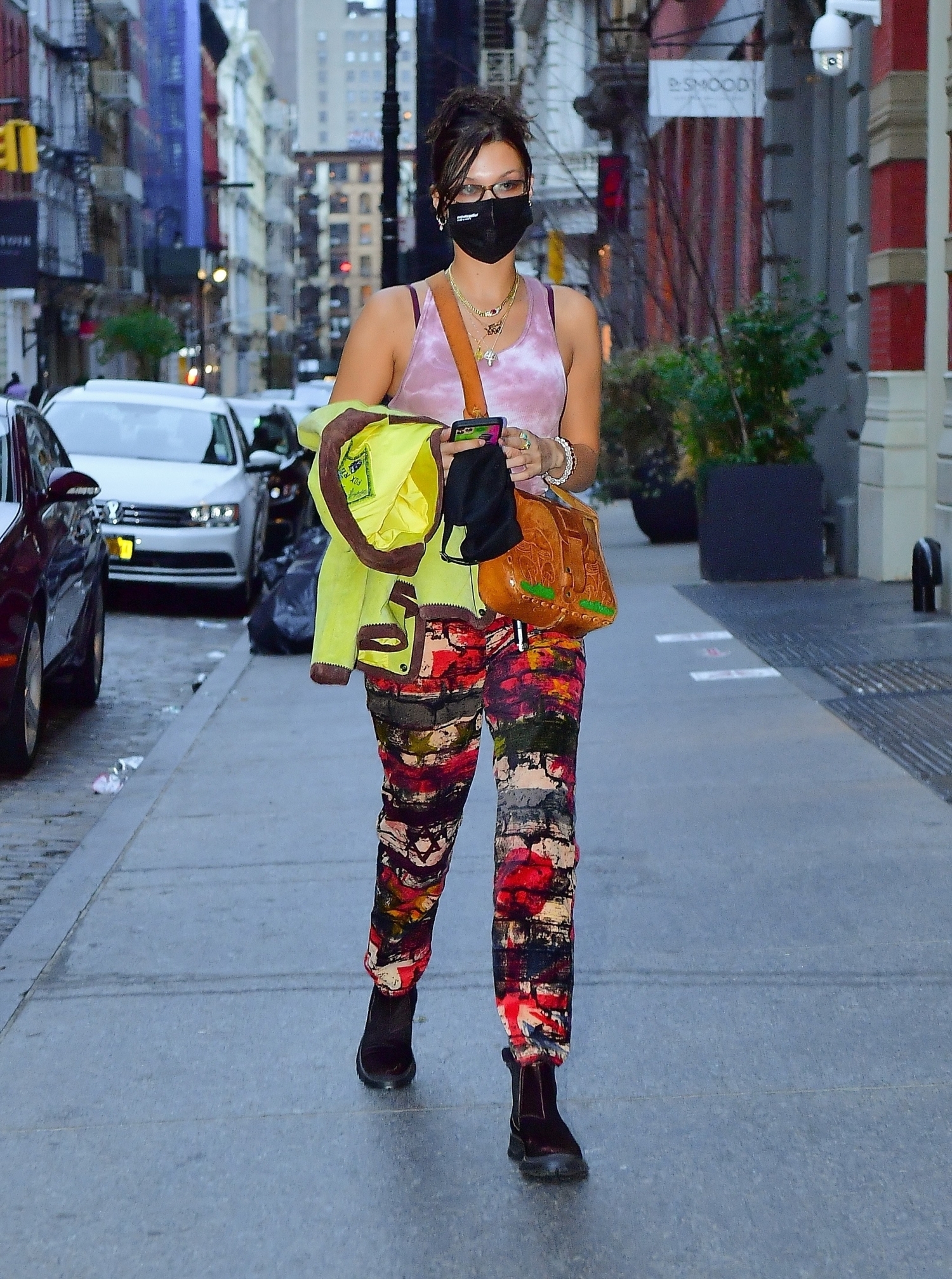 Kaikki vaatteet eri sävyä? Miksi ei! Syyskuussa Hadid edusti asussa, johon kuuluivat kirjavat housut, vaaleanpunainen toppi, oranssi käsilaukku ja neonkeltainen takki.