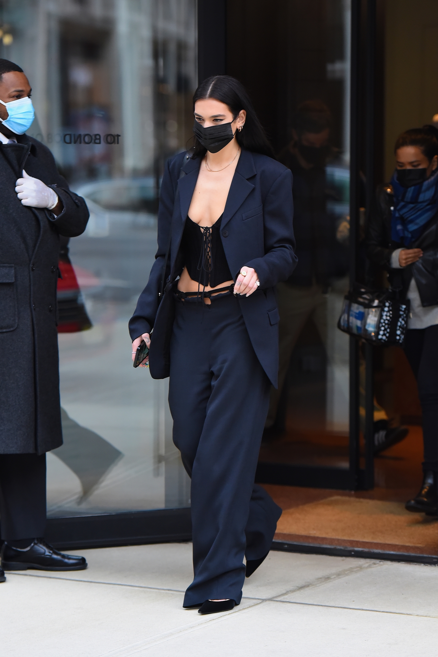 Asukokonaisuuden huomiotaherättävin yksityiskohta on seksikäs korsetti, joka on kuluneen vuoden aikana noussut monen julkisuudesta tutun kasvon suosikkivaatteeksi. Dua Lipa oli omassa lookissaan yhdistänyt sen upeasti rentoon housupukuun.
