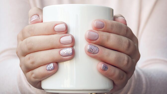 Esimerkiksi kynnen reunan osittainen lakkaaminen glitterillä on helppo ja nopea tapa tuoda juhlantuntua kynsille. Voit katsoa kuvan alta.