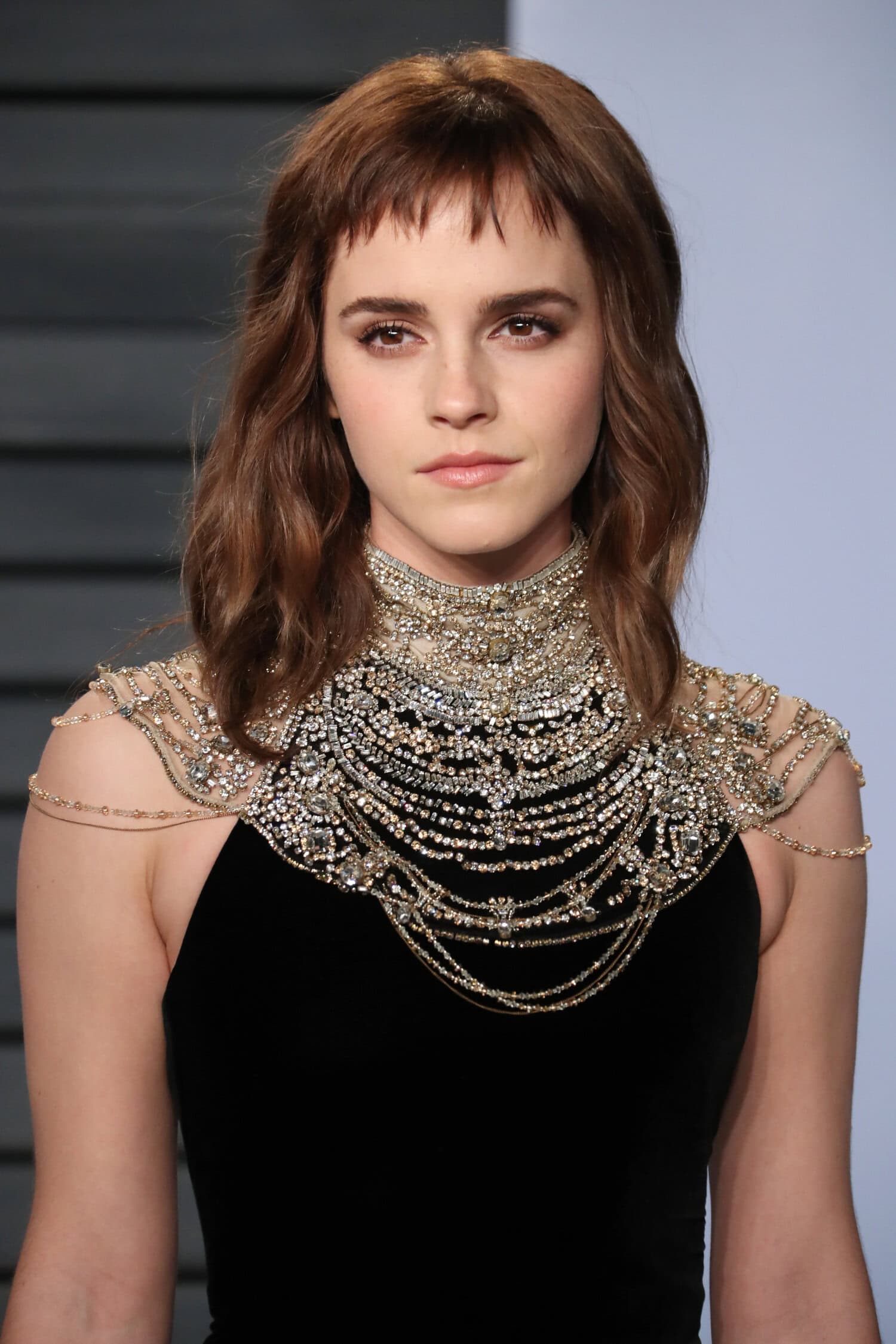 Näyttelijä Emma Watsonin otsahiukset ovat leikattu rikottuun tyyliin hyvin lyhyiksi.