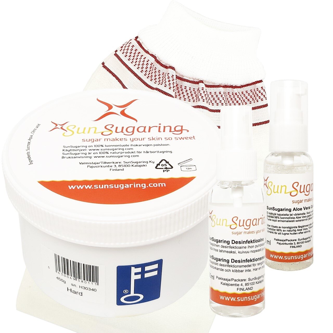 Pakkaus sisältää Hard-massan 450g, desinfiointiaineen, aloeveran, kuorintakintaan, bentoniittisavipurkin ja 10 kappaletta nitriilikäsineitä.