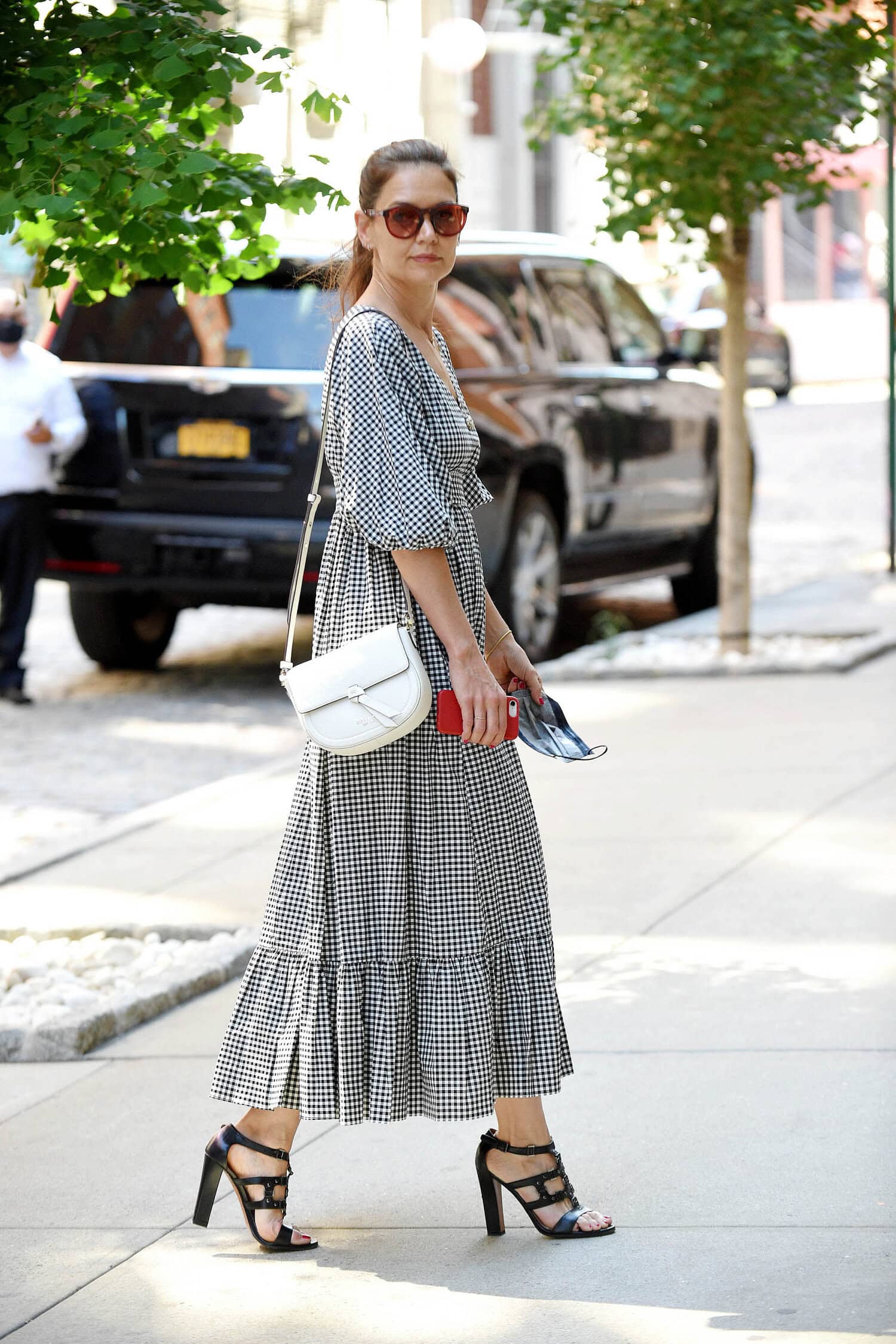 Holmesin yllä nähdään kukonaskelkuosilla varustettu mekko, jonka helma hipoo nilkkoja. Lookiin kuuluvat myös mustat korolliset sandaalit, valkoinen olkalaukku sekä näyttävät aurinkolasit.