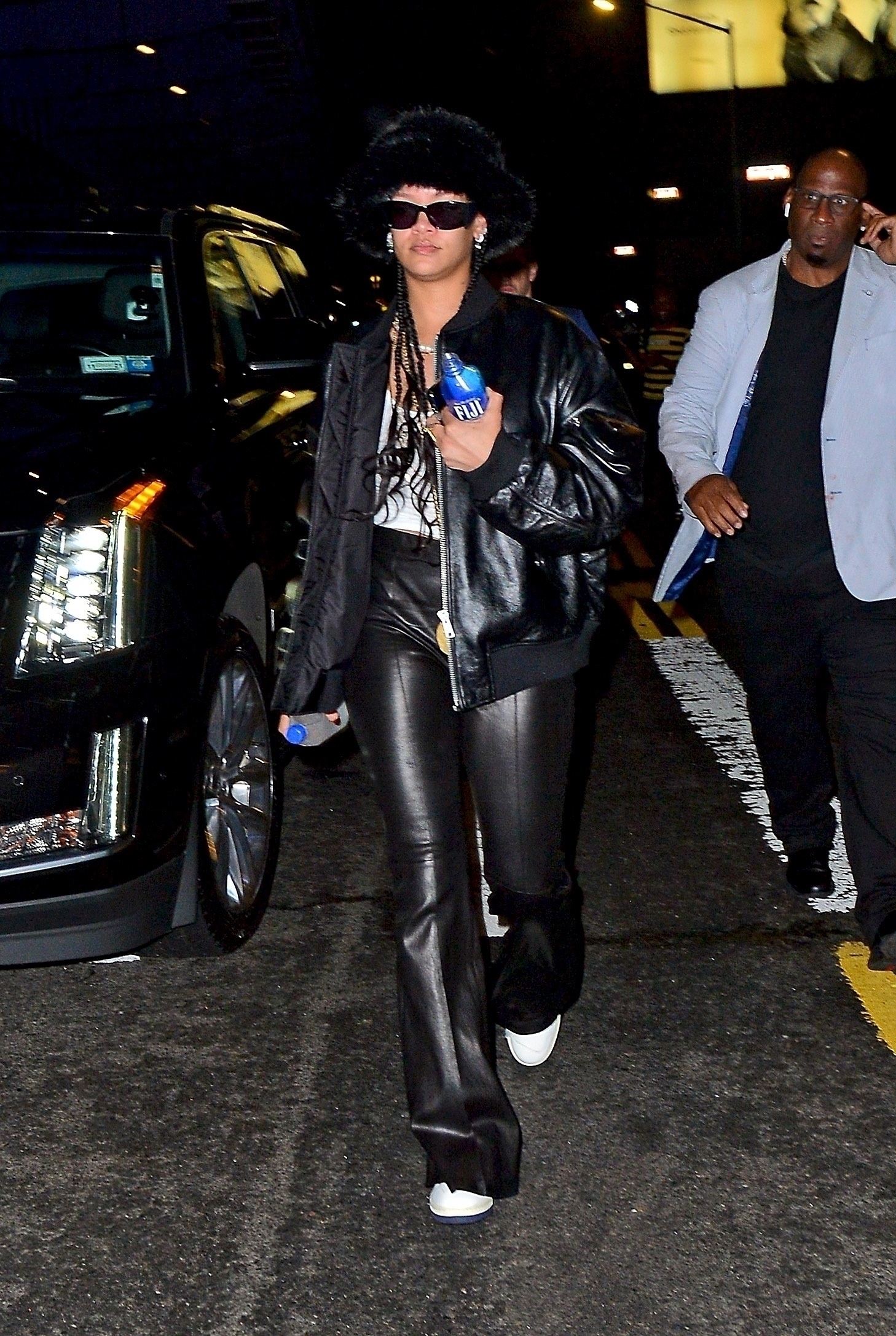 Myös Rihanna luotti viime viikolla mustien vaatteiden voimaan. Artistin nahka-asu sai kiinnostavan yksityiskohdan pörröisestä kalastajahatusta, joita Rihannan kaapista löytyy muissakin väreissä.