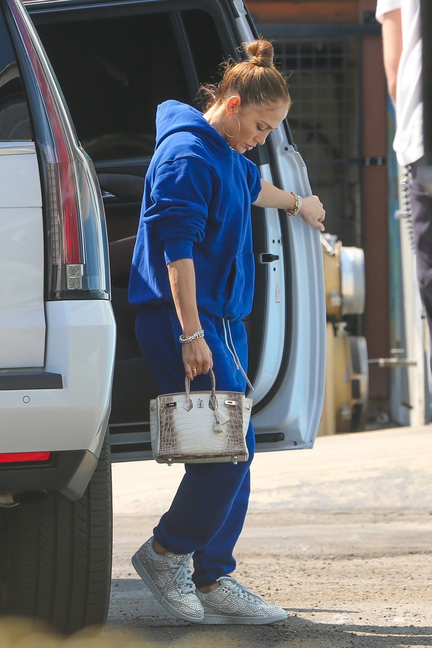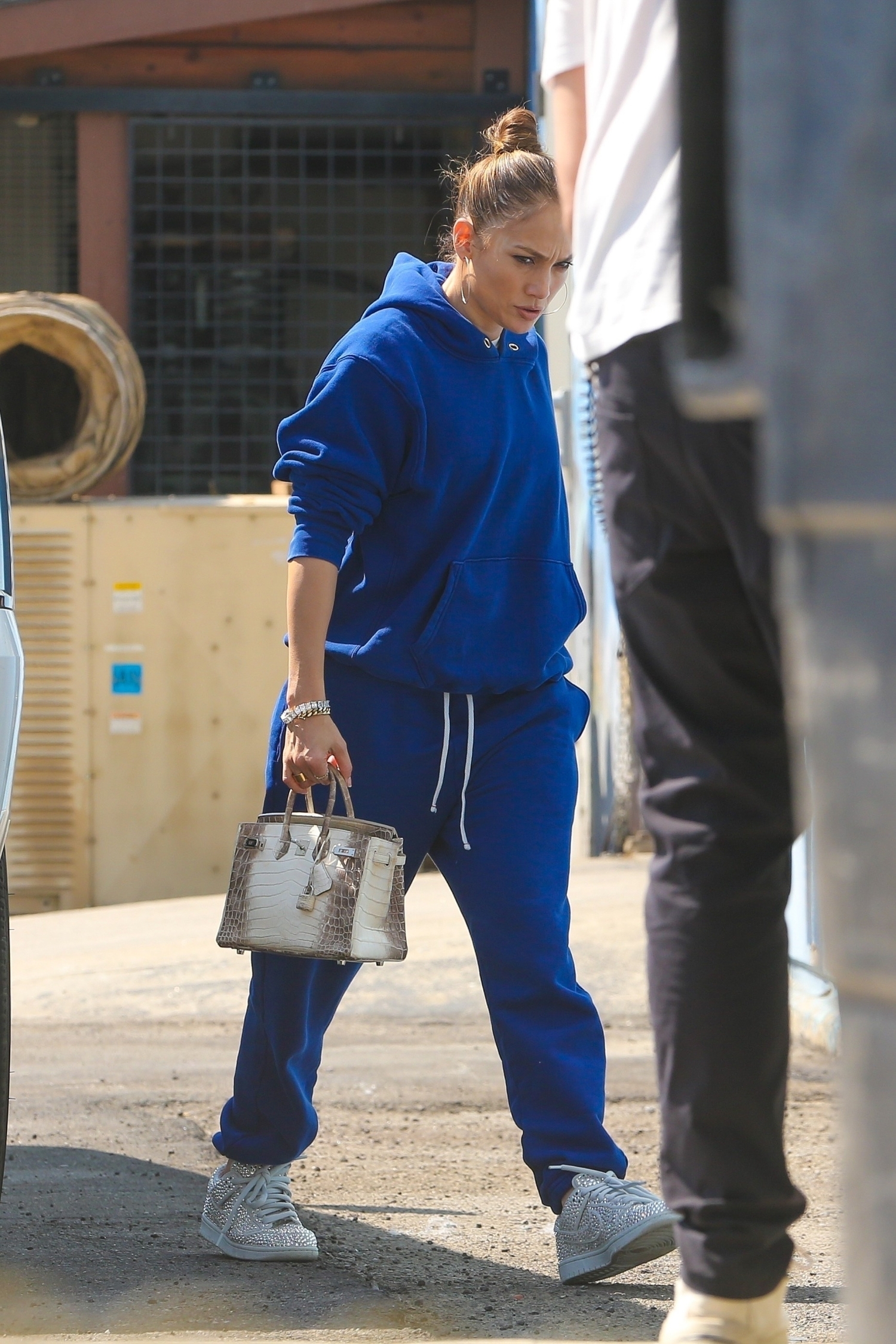 Tällä viikolla Lopez kuvattiin kuitenkin toisenlaisessa tyylissä, kun hän saapui studiolle Burbankissa. Tähden asussa yhdistyivät arkisuus ja näyttävyys. Lopez luotti syksyn trendiasuun (tai korona-ajan luottotyyliin) eli collegepukuun. Lopez yhdisti kirkkaansinisen asun Niken strassikoristeltuihin tennareihin sekä Hermèsin laukkuun. Vastaavanlainen krokotiilinnahkainen laukku on huutokaupattu vuonna 2014 hurjalla 185 000 dollarin hinnalla. Lopezin korvissa roikkuivat hänen tavaramerkkinsä: isot korvarenkaat.
