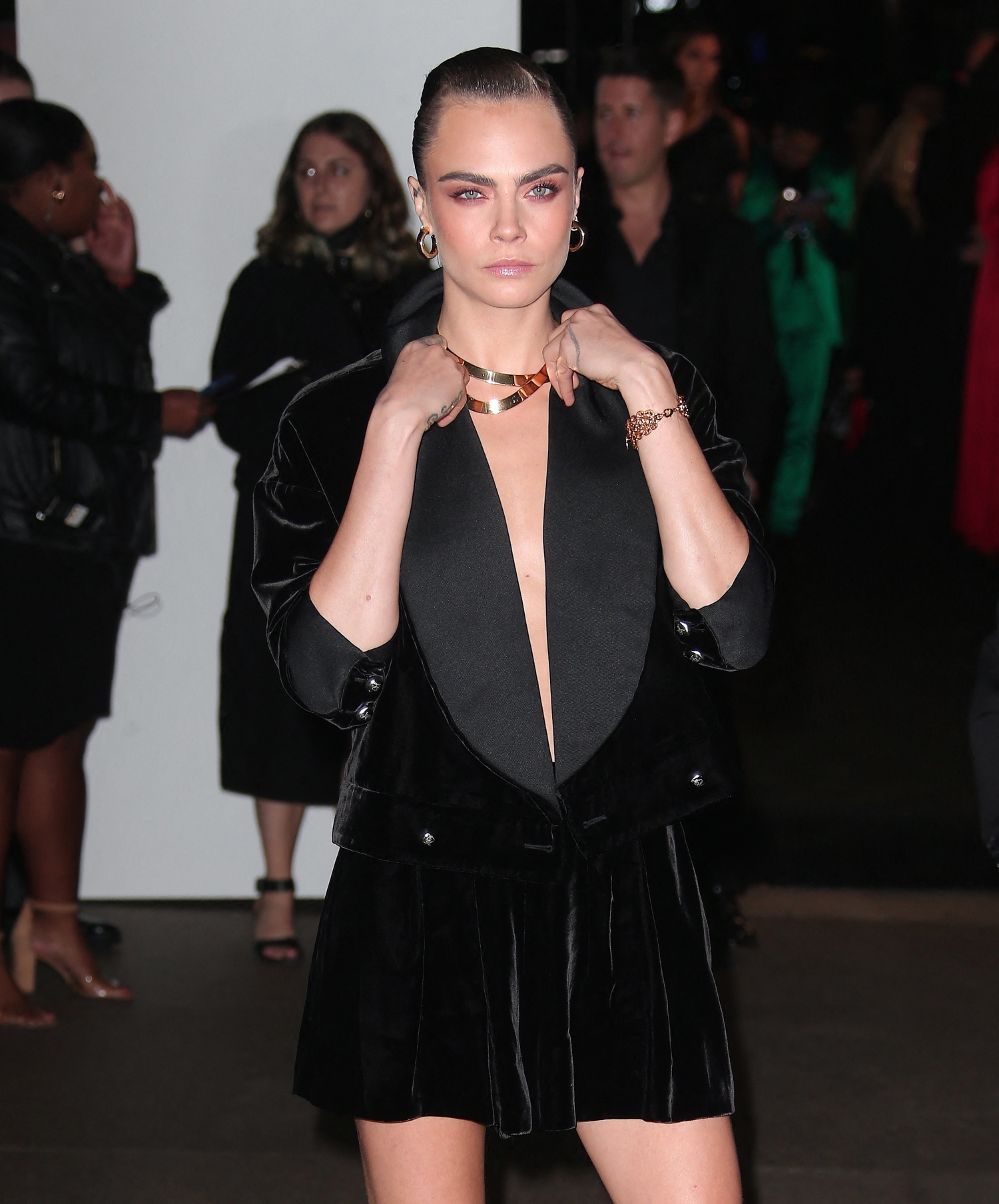 Cara Delevingne, 29, esitteli loppuvuoden juhliin loistavasti sopivan asukokonaisuuden, josta kelpaa ottaa mallia. Delevingne esiintyi mustassa, samettisessa bleiserissä ja samaa sarjaa olevassa hameessa. Asu ei kuitenkaan muistuta mitä tahansa maanantaiaamun toimistolookkia, sillä Delevingne jätti paidan kotiin ja bleiseri muuttuikin hetkessä bilevaatteeksi.