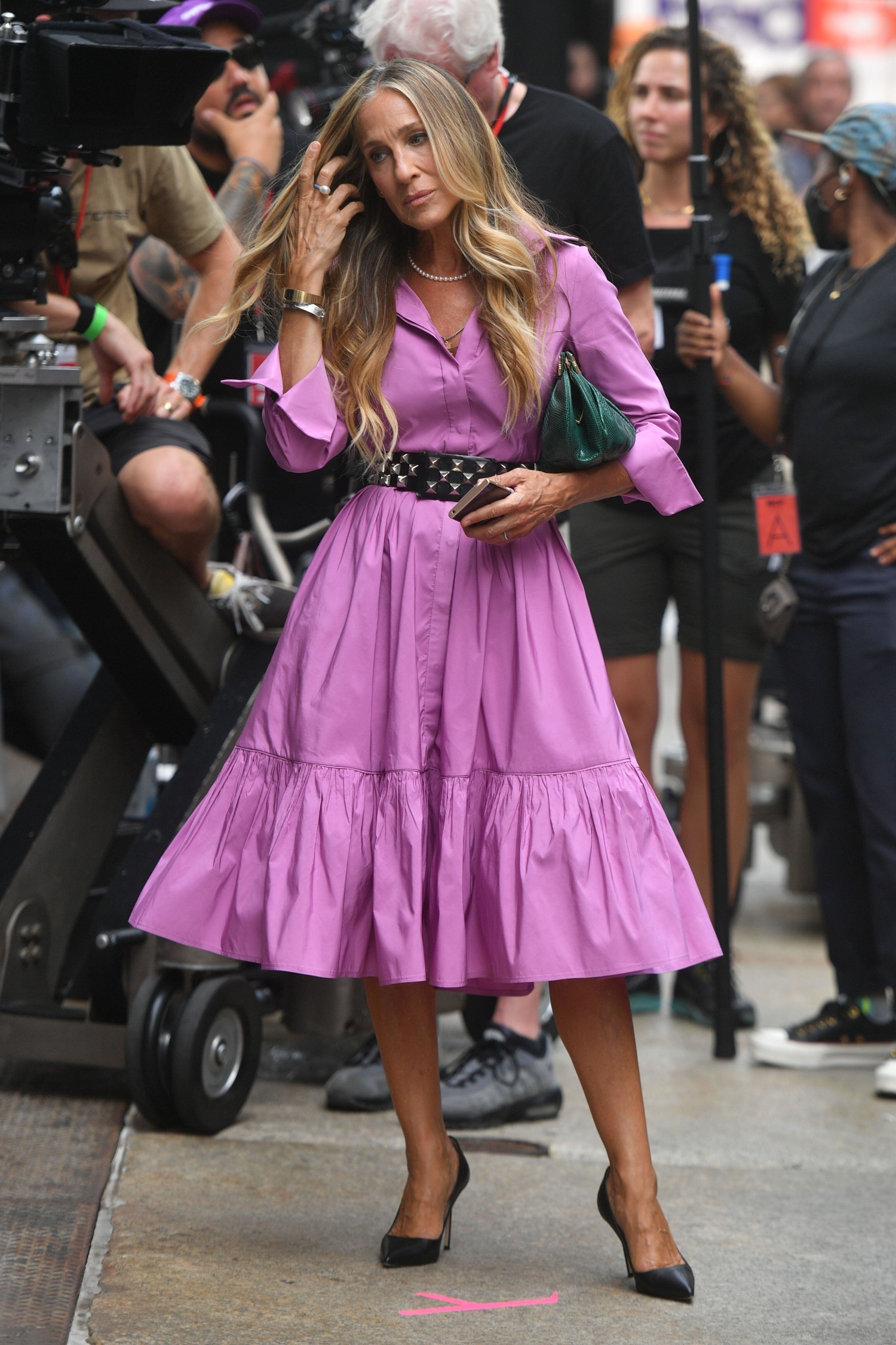 Asusteilla saa ihmeitä aikaan ja niiden avulla moni asukokonaisuus saa hetkessä täysin uudenlaisen ilmeen. Mekon kaveriksi sopii täydellisesti näyttävä paksu vyö ja asun kanssa eri väriä oleva laukku, kuten Bradshaw todistaa.