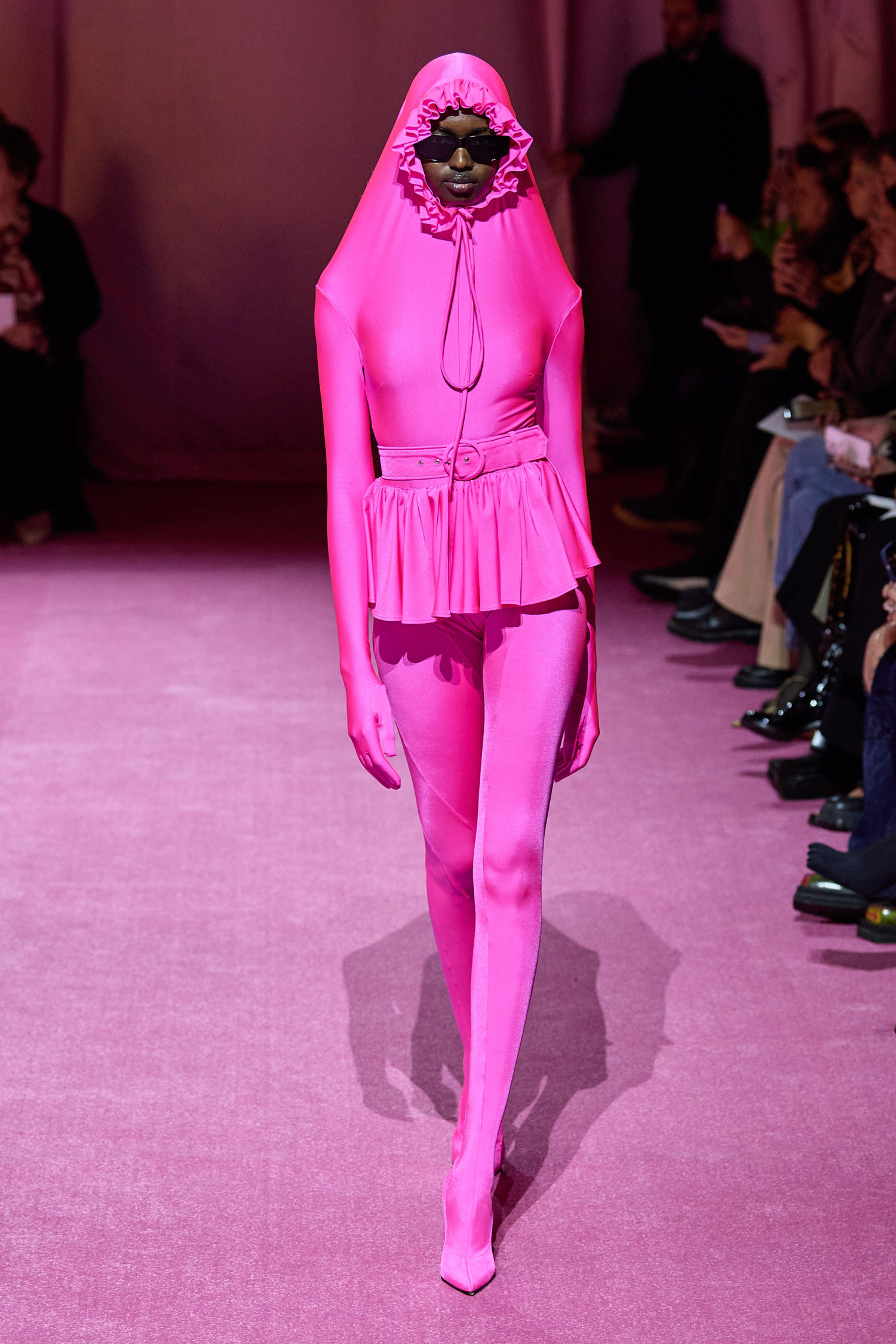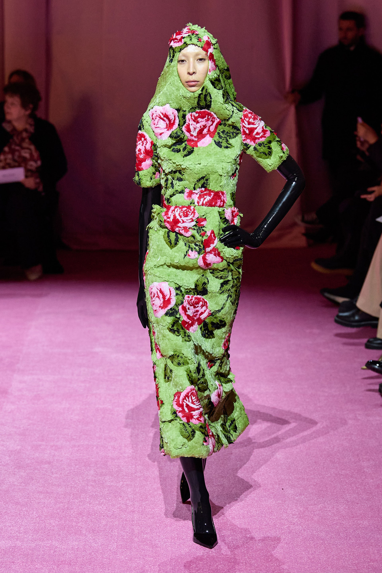 Näytöksessä näkyi paljon asuja, joissa koko asu on päästä varpaisiin samaa kuosia tai kangasta ja vain kasvot jäävät näkyville. Vaatteiden yhdistelyä toisiinsa ei siis juuri tarvitse miettiä.