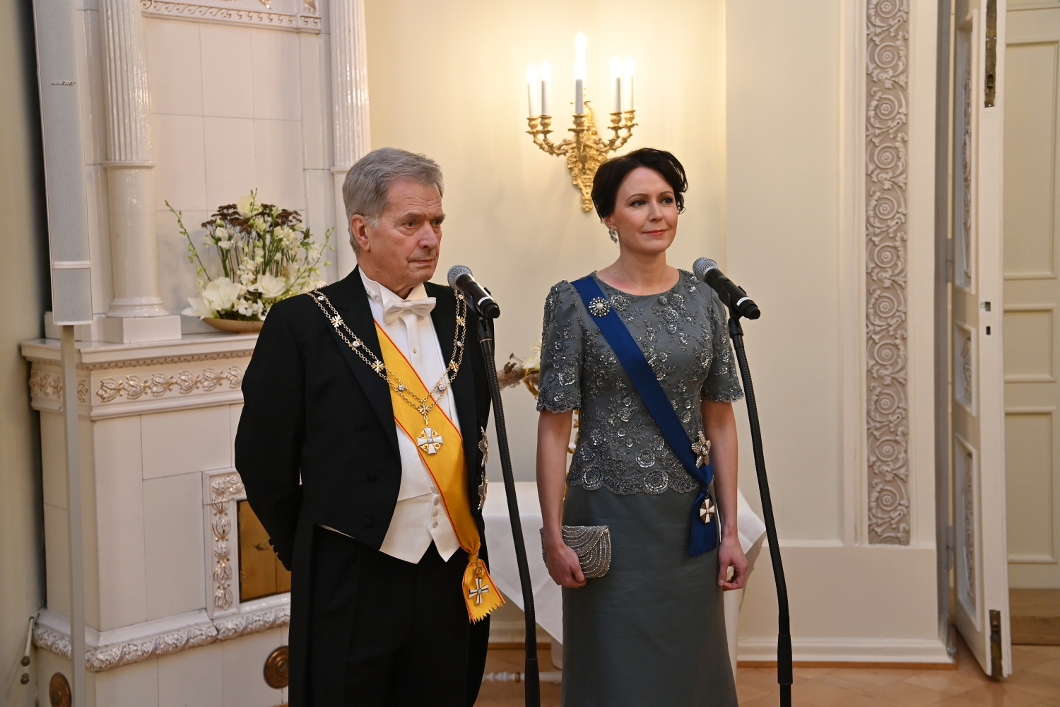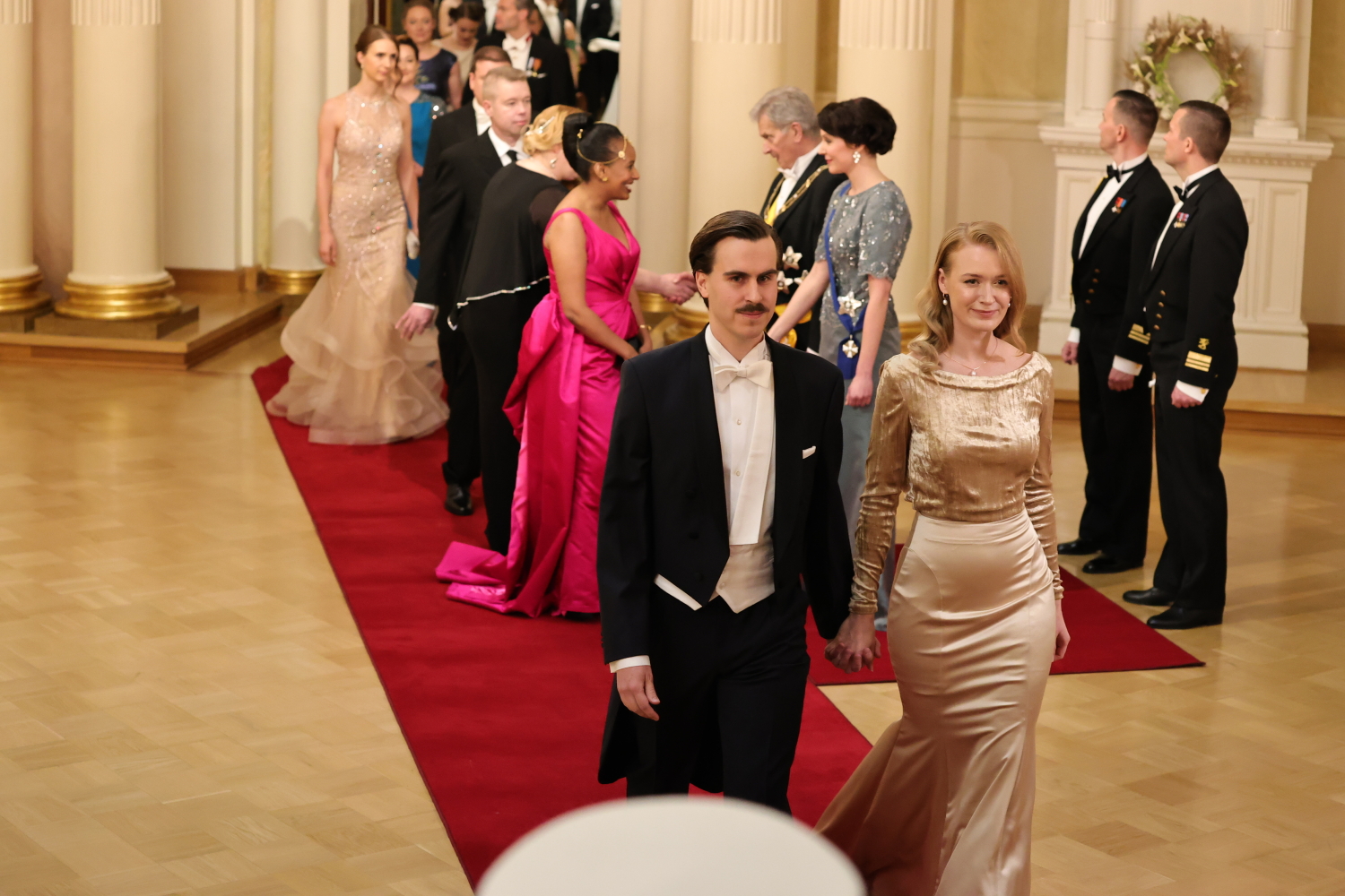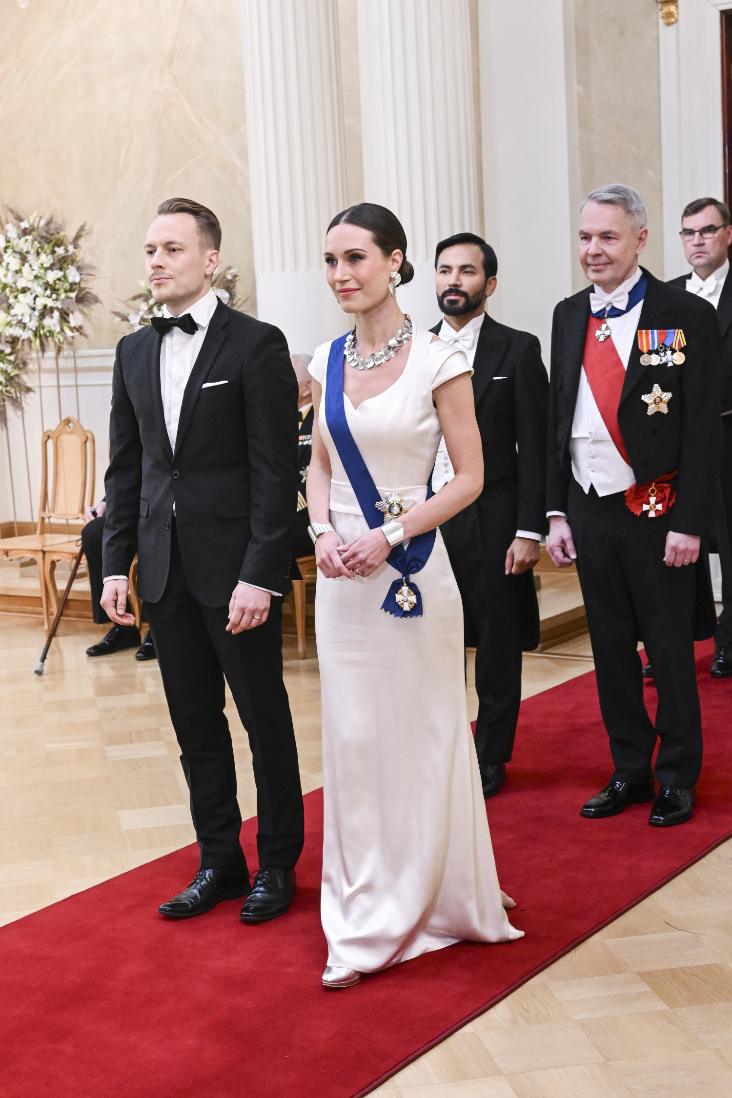 Pääministeri Sanna Marin, 37, saapui Linnaan 15 vuotta vanhassa vaaleassa puvussa. Puvun on suunnitellut Sari Hörkkö ja stylistinä toiminut Vesa Silver. Iltapuvun lisäksi Marinilla oli yllään Kalevalan korva- ja rannekorut. Puku on ommeltu vuosia sitten, mutta Marin oli sen ensimmäinen omistaja.