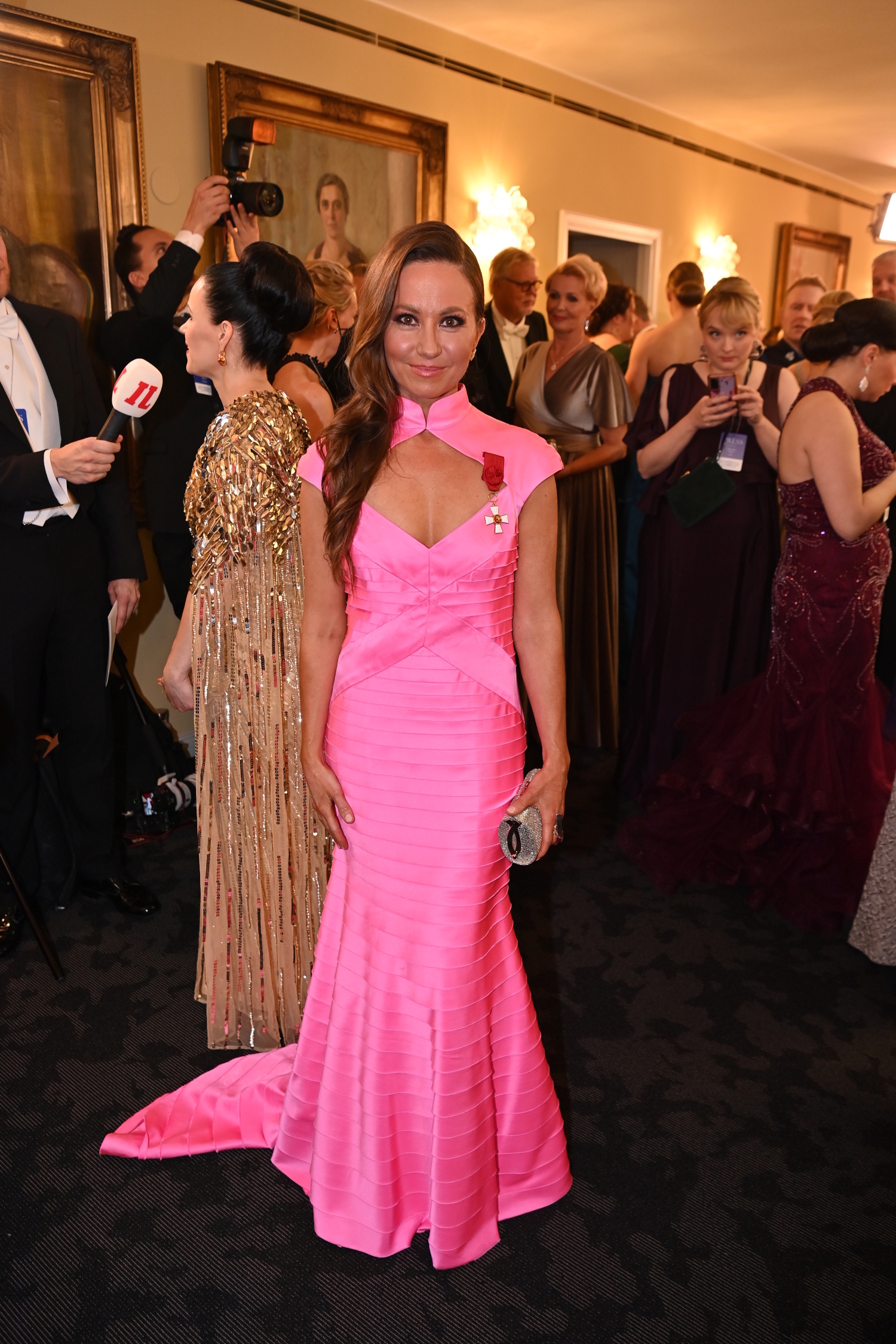 Kansanedustaja Jaana Pelkonen, 45, asteli Linnan juhliin kirkkaan pinkissä puvussa. Asun suunnittelijana on toiminut Teemu Muurimäki. Asu on nähty Pelkosen yllä 15 vuotta sitten Euroviisuissa.