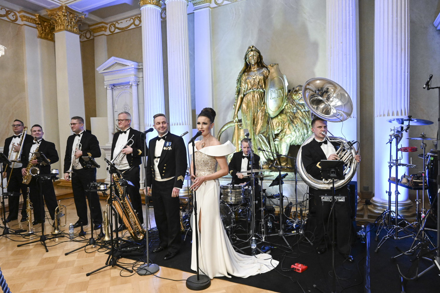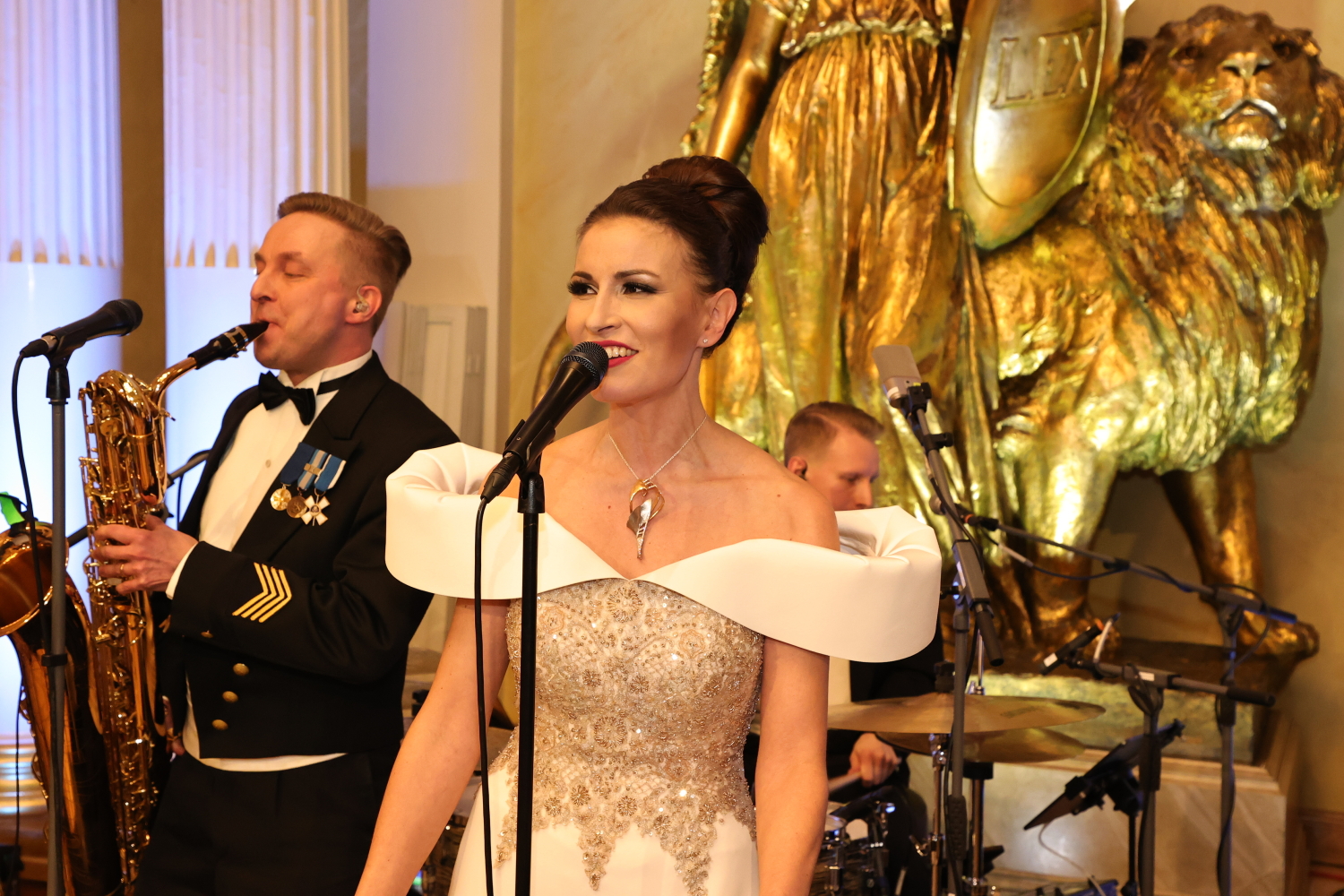 Laulaja ja näyttelijä Maria Lund tanssitti juhlavieraita klassinen luomus yllään. Puku oli muotisuunnittelija Jukka Rintalan käsialaa. Valkoisen puvun kruunasivat terälehtimäisesti avautuva yläosa ja kultainen koristelu.
