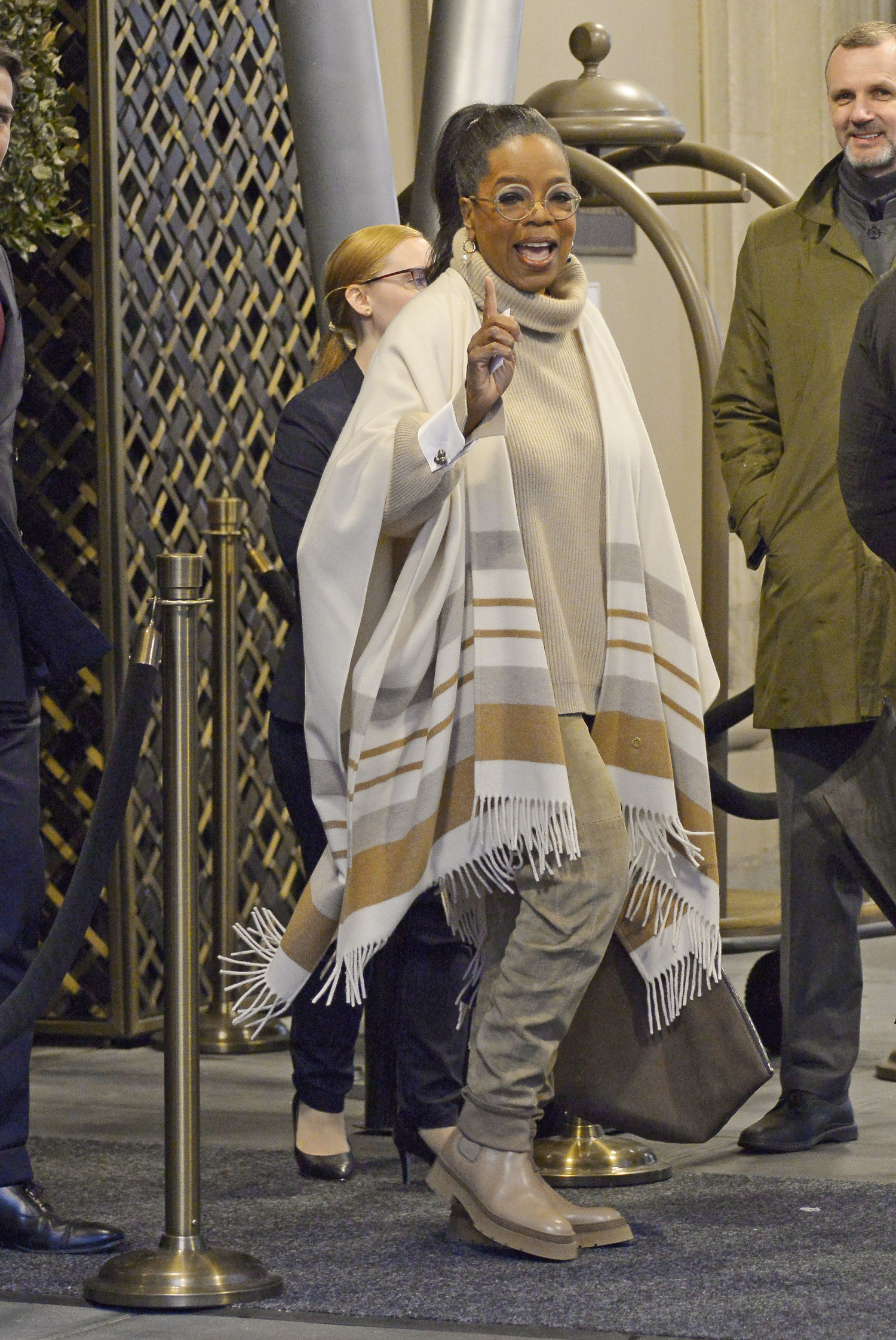 Winfrey oli valinnut ylleen korkeakauluksisen neuleen ja hapsullisen ponchon. Hänen asunsa kulmakivenä toimivat beigen ja ruskean eri sävyt. Kokonaisuus oli rento, mutta tyylikäs.