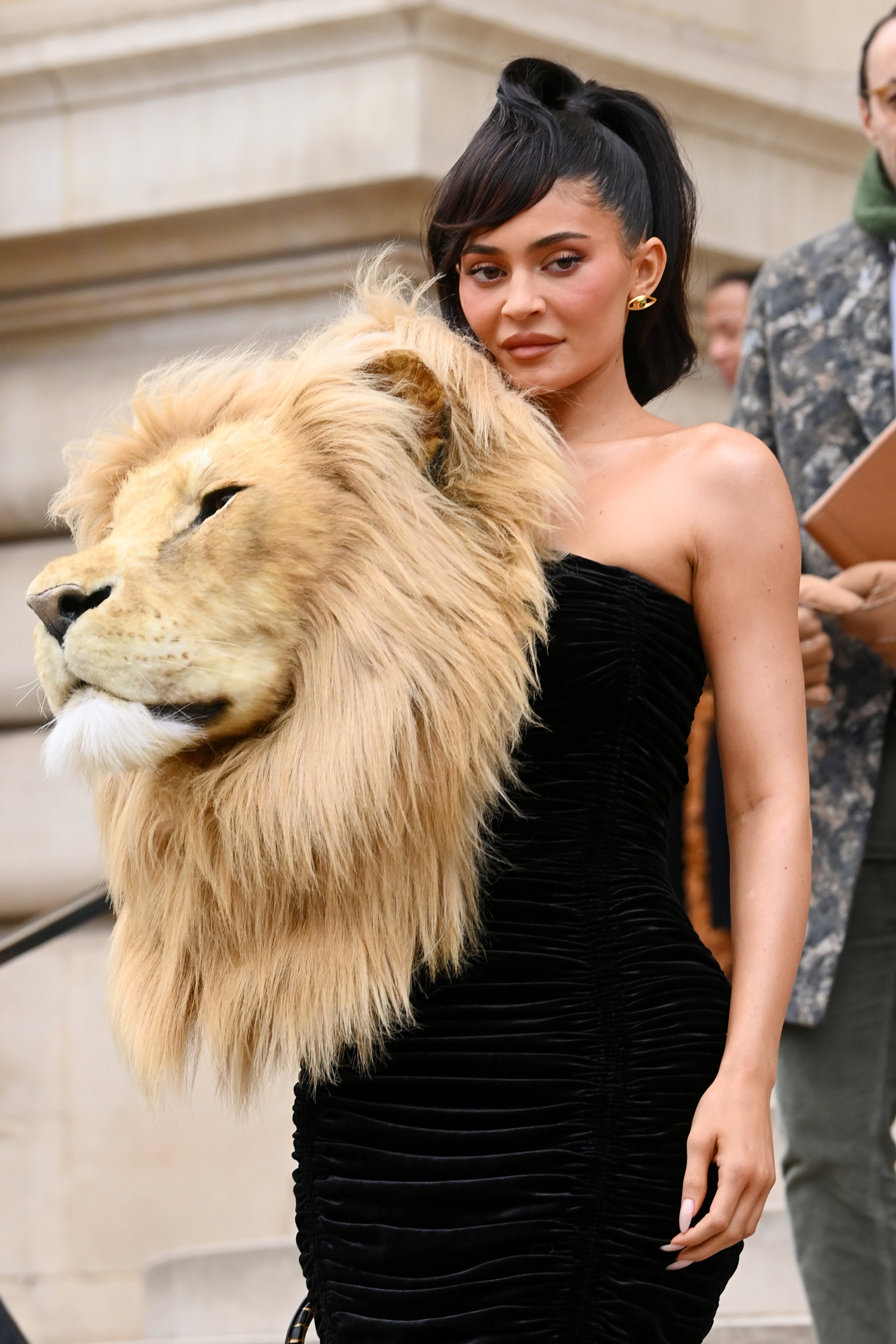 Tosi-tv-tähti Kylie Jennerin, 25, asu sai hieraisemaan silmiä Pariisin muotiviikolla. Tosi-tv-tähden asua koristi nimittäin oikean kokoinen leijonan pää.