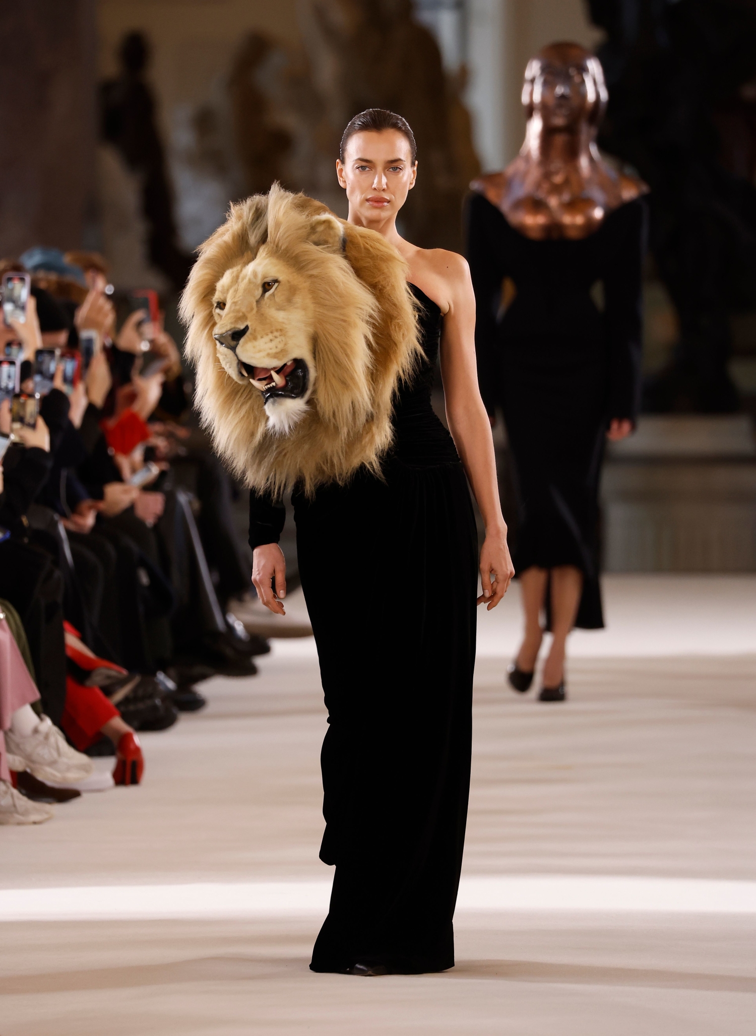 Jenner nähtiin muotitalo Schiaparellin muotinäytöksessä mustassa, olkaimettomassa mekossa ja kohua herättäneessä leijonan päässä.