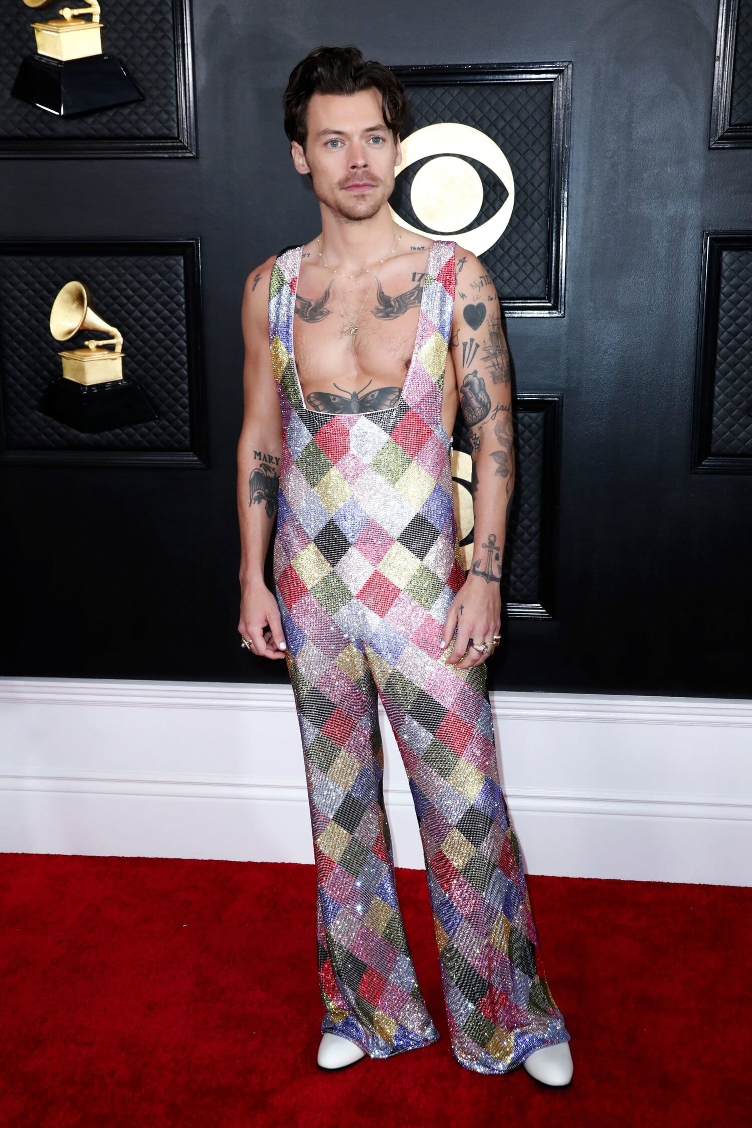 Näyttelijänä ja muusikkona ansioitunut Harry Styles, 29, pukeutui rinnan paljastavaan jumpsuitiin. Salmiakkikuvioinen, värikäs luomus oli kuorrutettu Swaroskin kristalleilla.
