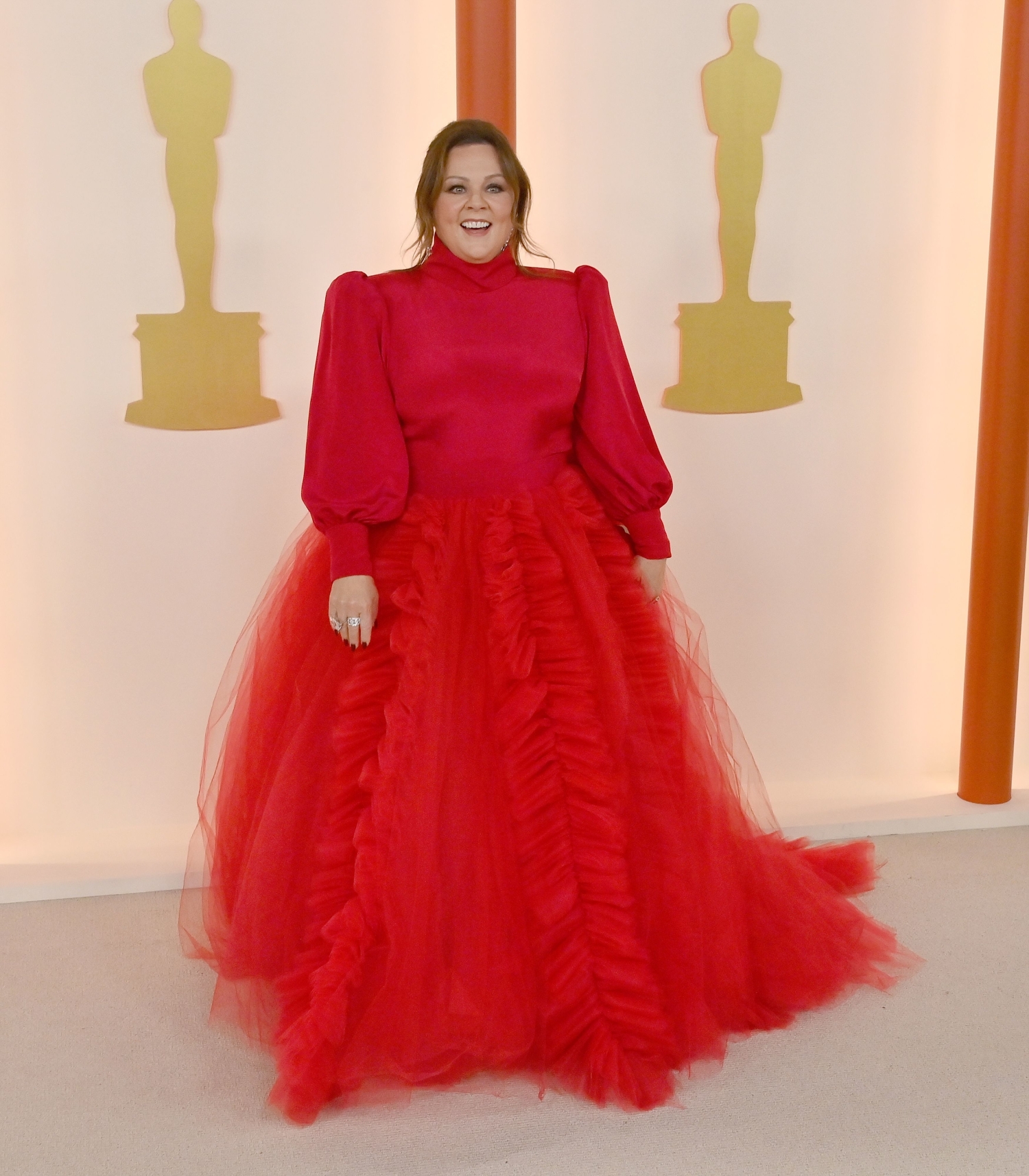 Näyttelijä ja koomikko Melissa McCarthy, 52, luotti tänä vuonna näyttävän punaiseen Christian Sirianon suunnittelemaan korkeakauluksiseen iltapukuun.