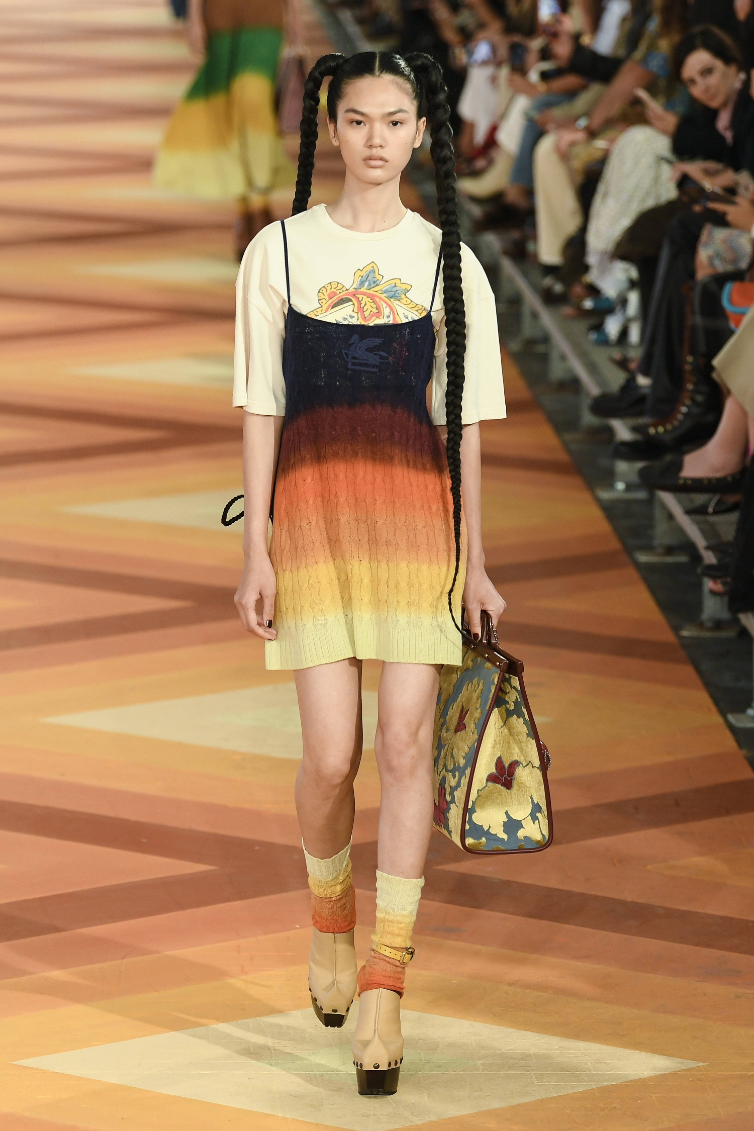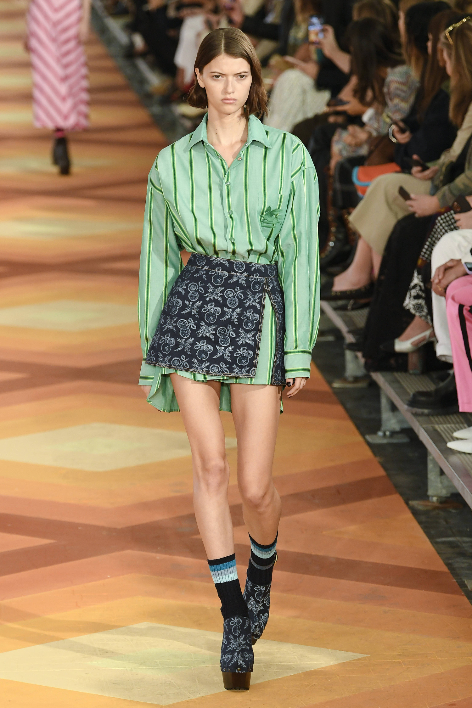 Sukkia korkokengissä nähtiin myös kesän muotinäytöslavoilla. Alla olevissa kuvissa käy ilmi muotitalo Etron versiot sukkatyylistä. Tämä trendi on oikein sopiva Suomeen, sillä kesäisin varpaita palelee aina ja hyttyset ovat kiinni nilkoissa.