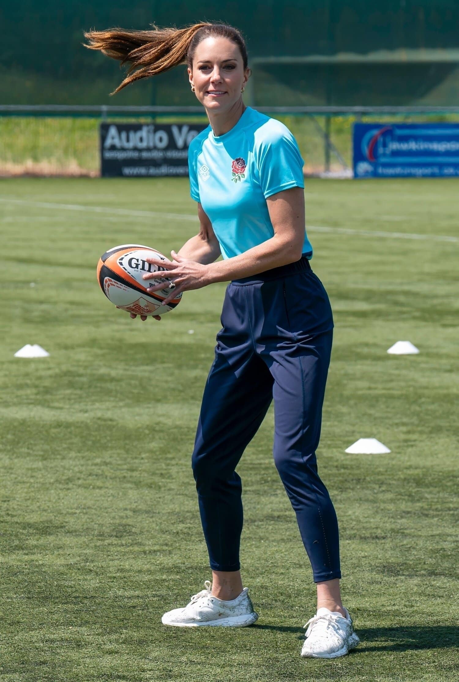 Walesin prinsessa Catherine, 41, kiepsautti hiukset rennolle ponnarille pelatessaan rugbyä. Hän ei nousevista pörröhiuksista piitannut vaan antoi hiusten olla rennolla ponnarilla.