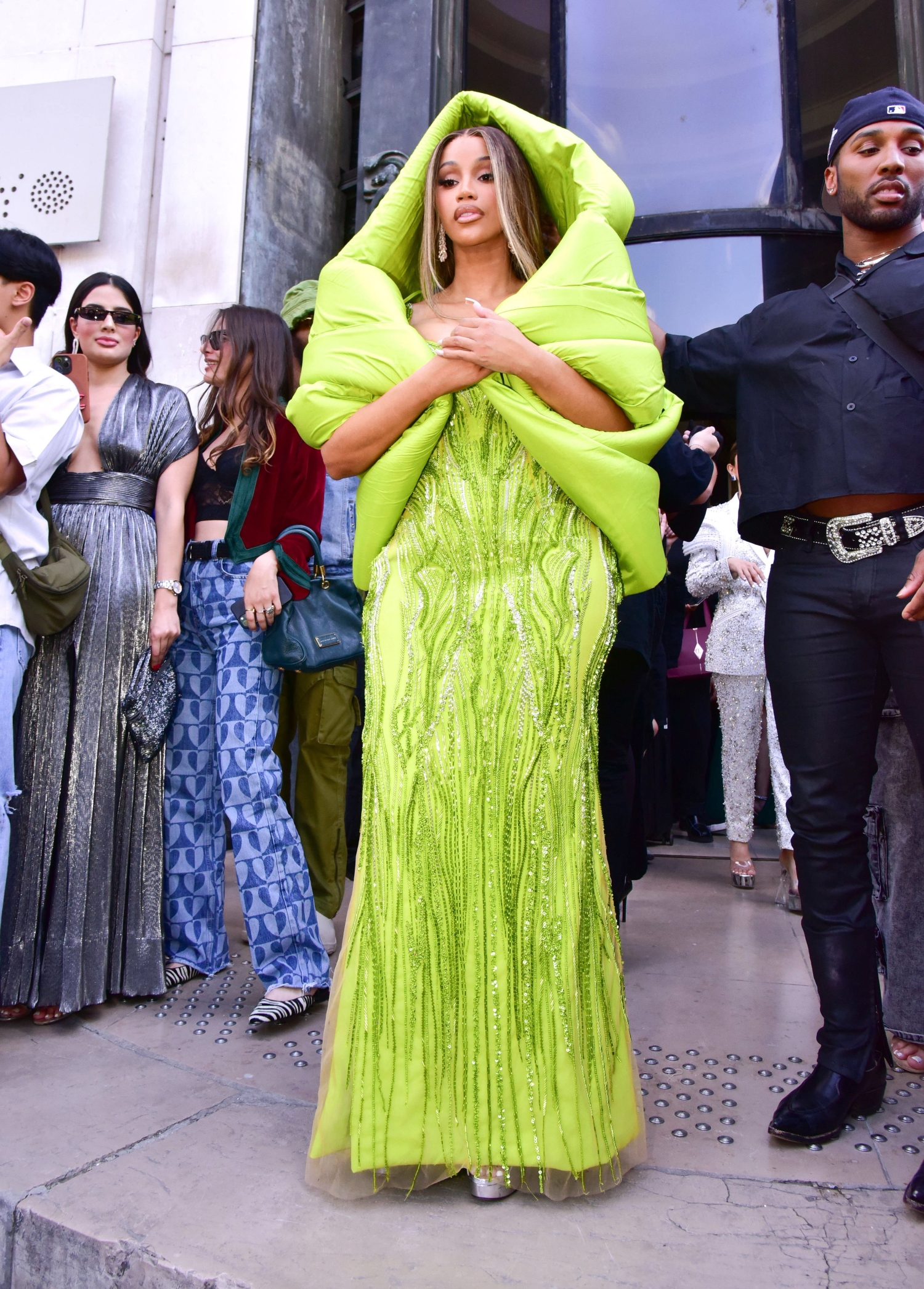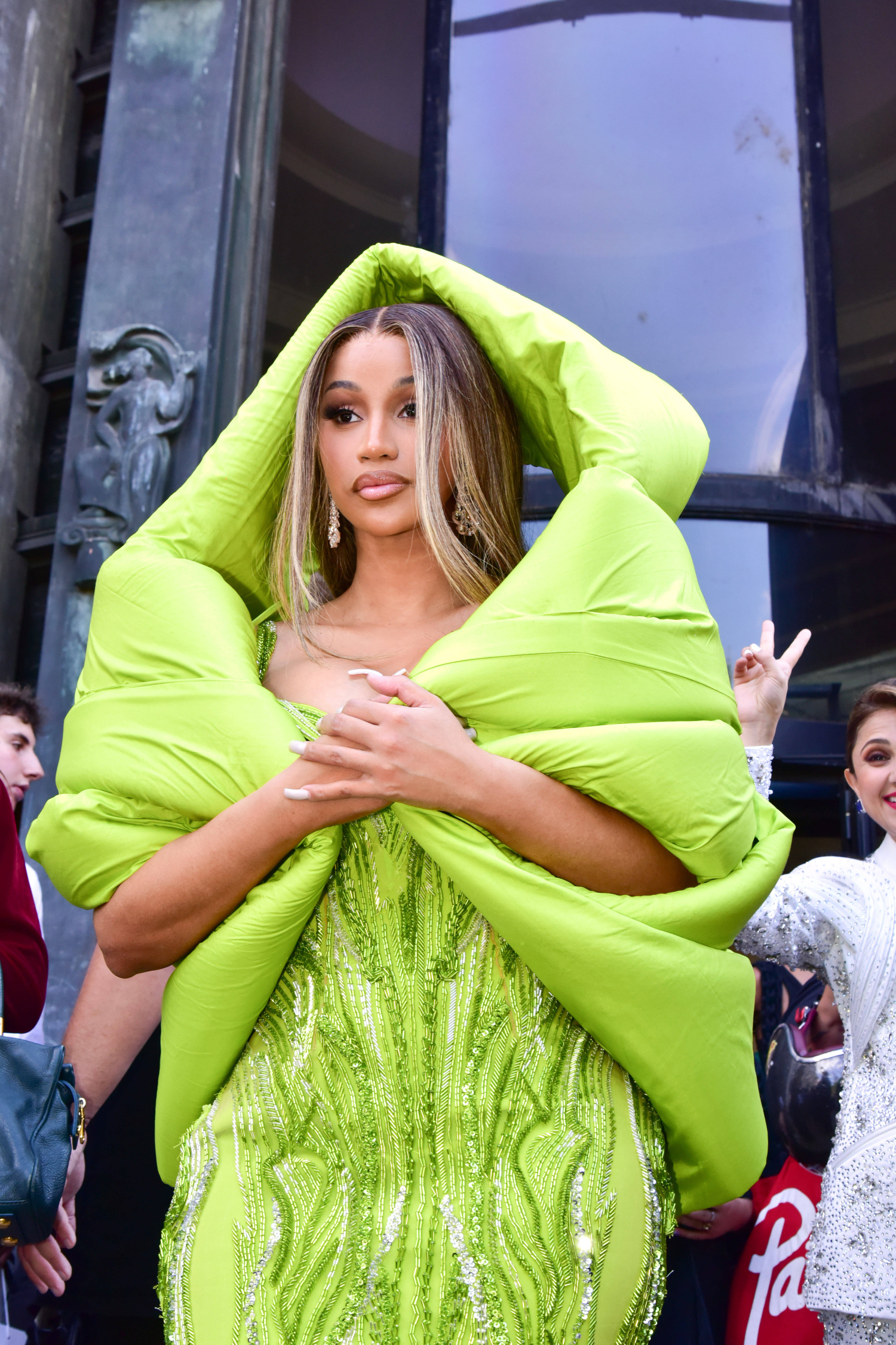 Cardi B:n asu oli limenvihreä kokonaisuus, jonka katseenvangitsijana oli tyynyä lievästi muistuttava bolero. Bolero oli varustettu myös hupulla.