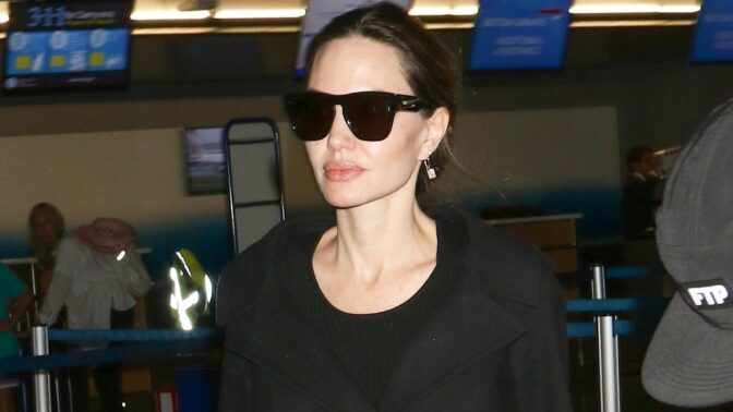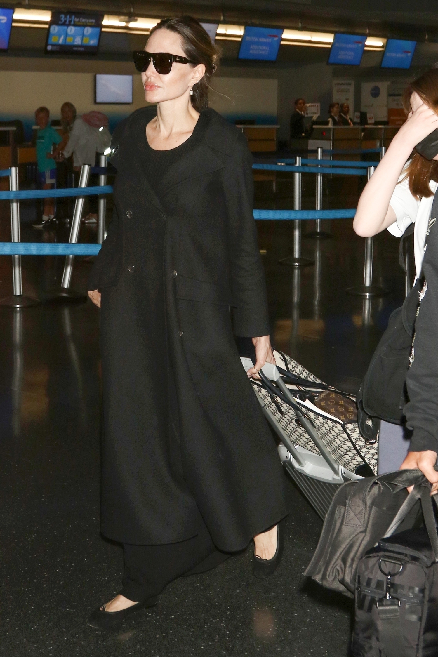 Nyt Jolie bongattiin New Yorkissa lentokentällä edustaen kokomustassa. Hänen asunsa oli rento, mutta takin ja mekon pituudesta johtuen jopa hieman dramaattinen. Molemmat nimittäin ulottuivat nilkkoihin saakka vieden asun painopisteen alas.