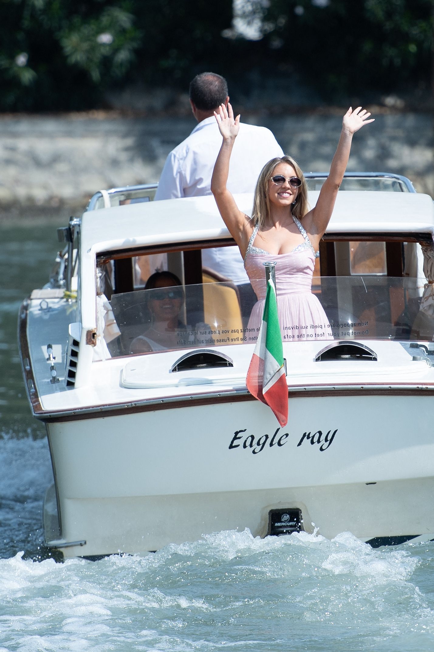 Sweeney saapui juhliin veneen kyydillä hehkuen vanhanajan Hollywood-glamouria.
