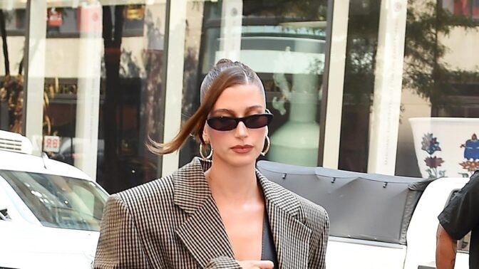 Tyylitaituri Bieber todistaa, että muotinäytöksissä nähdyt lookit voivat toimia myös sellaisenaan katukuvassa. Bieber oli valinnut päälleen voimakkaalla hartialinjalla varustellun Saint Laurentin power suit -puvun, johon hän oli yhdistänyt ruskeat kiiltonahkaiset avokkaat, sekä mustat aurinkolasit. Näyttävään tyyliin sopivat myös Bieberin isot korvarenkaat. Lähes tismalleen sama asukokonaisuus nähtiin tämän syksyn Saint Laurentin syysmuotinäytöksessä. Tämän puvun hartialinja on huomattavan voimakas, mutta se toimii silti erinomaisesti: mitä jykevämpi, sen parempi!