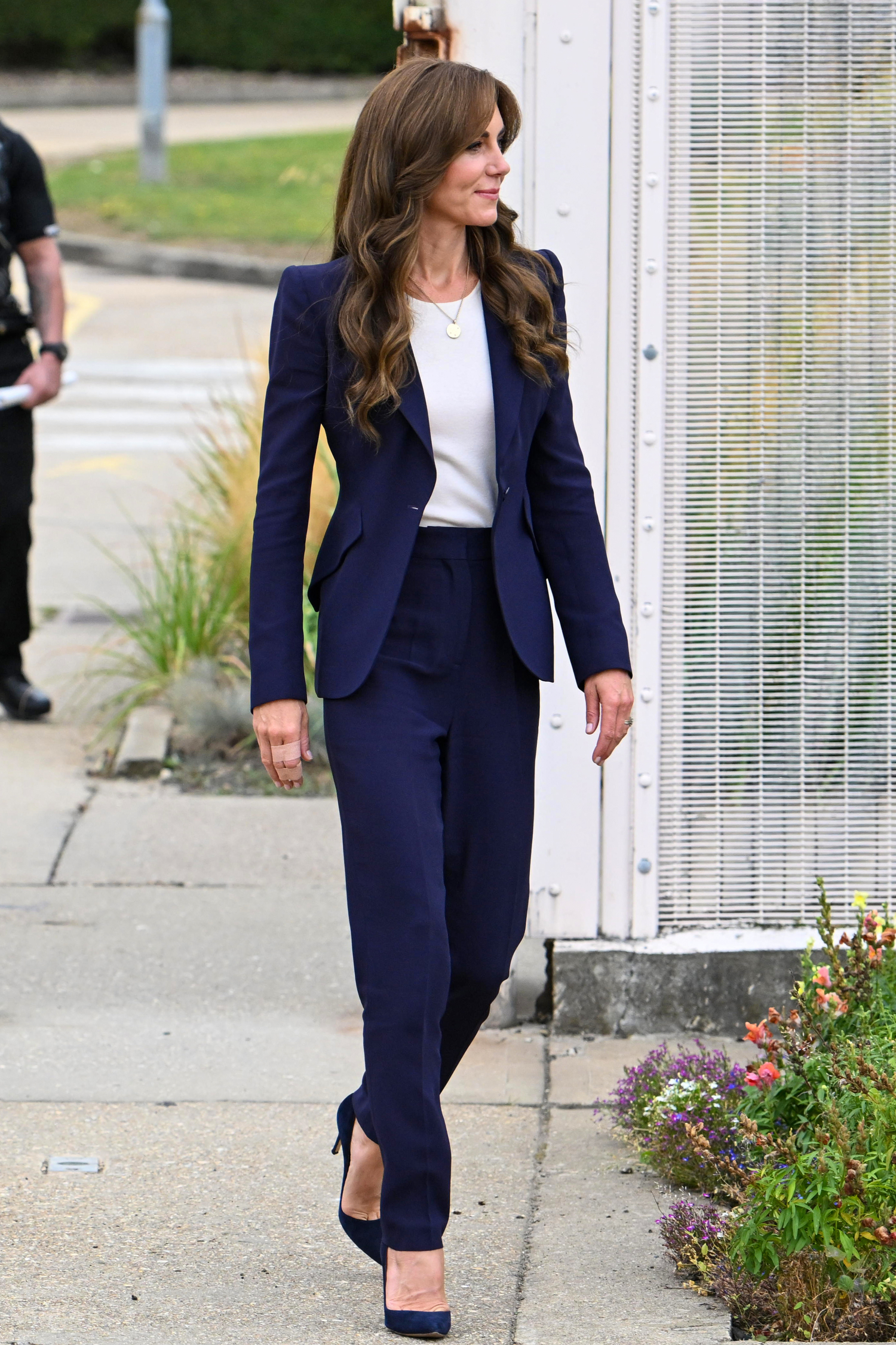 Ruskeiden hiusten hehkua vielä vahvisti Katen päällä nähty tummansininen jakkupuku. Ruskea ja sininen ovat siis todella elegantti kombo.