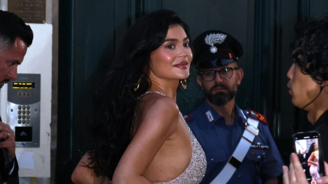 Jenner osallistui muotitalo Schiaparellin muotinäytökseen beigessä, kimaltavassa iltapuvussa. Hän oli yhdistänyt iltapukuun Schiaparellin vaaleat korkokengät, joiden kärjessä on varvaskuviointi.