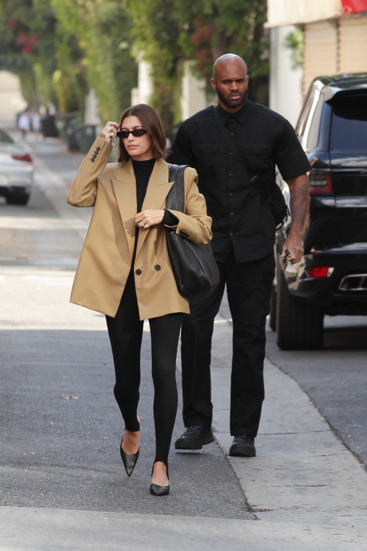 Hailey Bieber, 26, bongattiin kaupungilta asussa, joka huokuu 80-luvun fiilistä. Bieber oli sonnustautunut asuun, jossa yhdistyivät takavuosien mielipiteitä jakavat hiihtarit, eli kantapään alle ulottuvat legginsit sekä suurilla olkatoppauksilla varusteltu jakku.