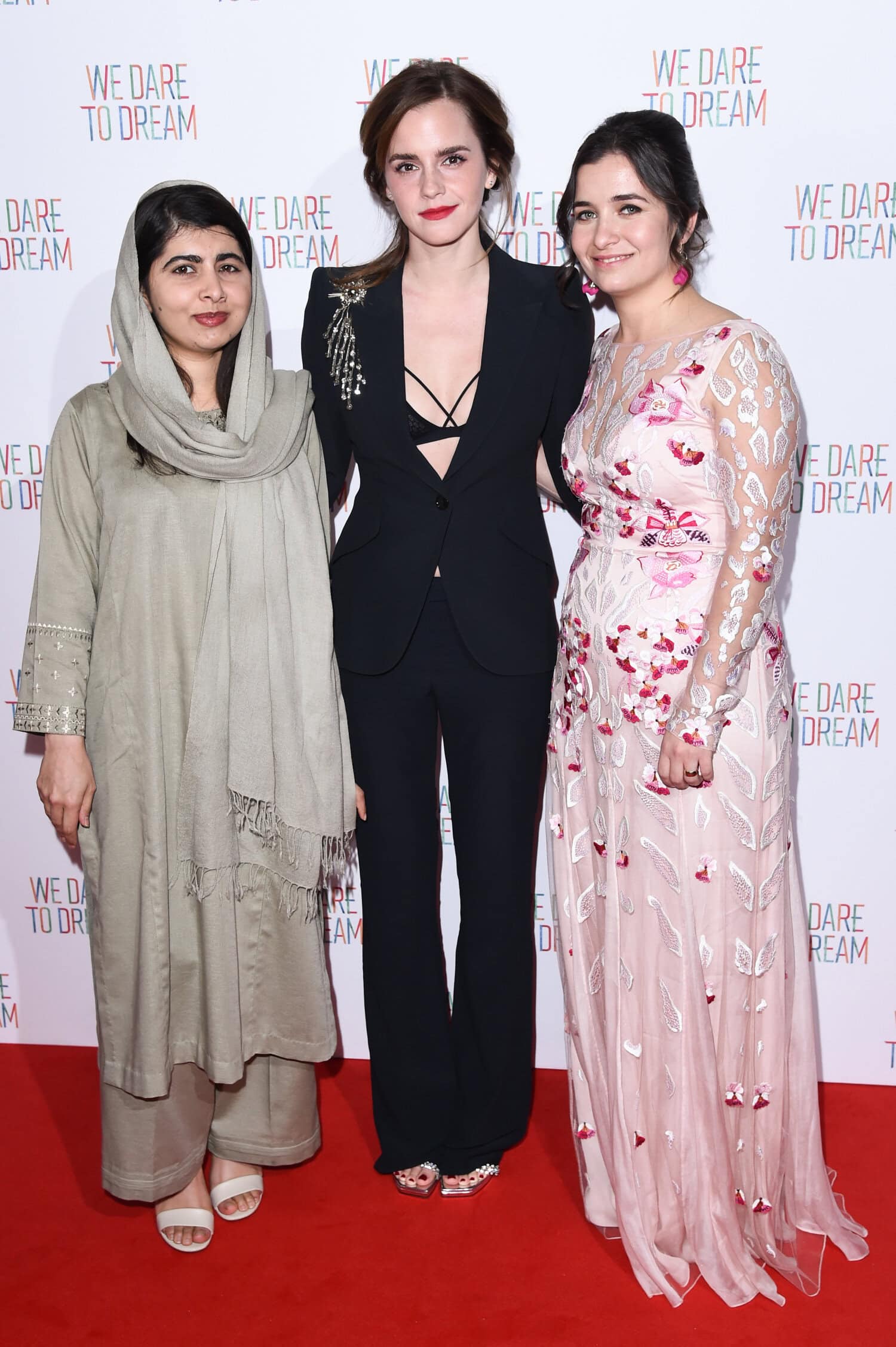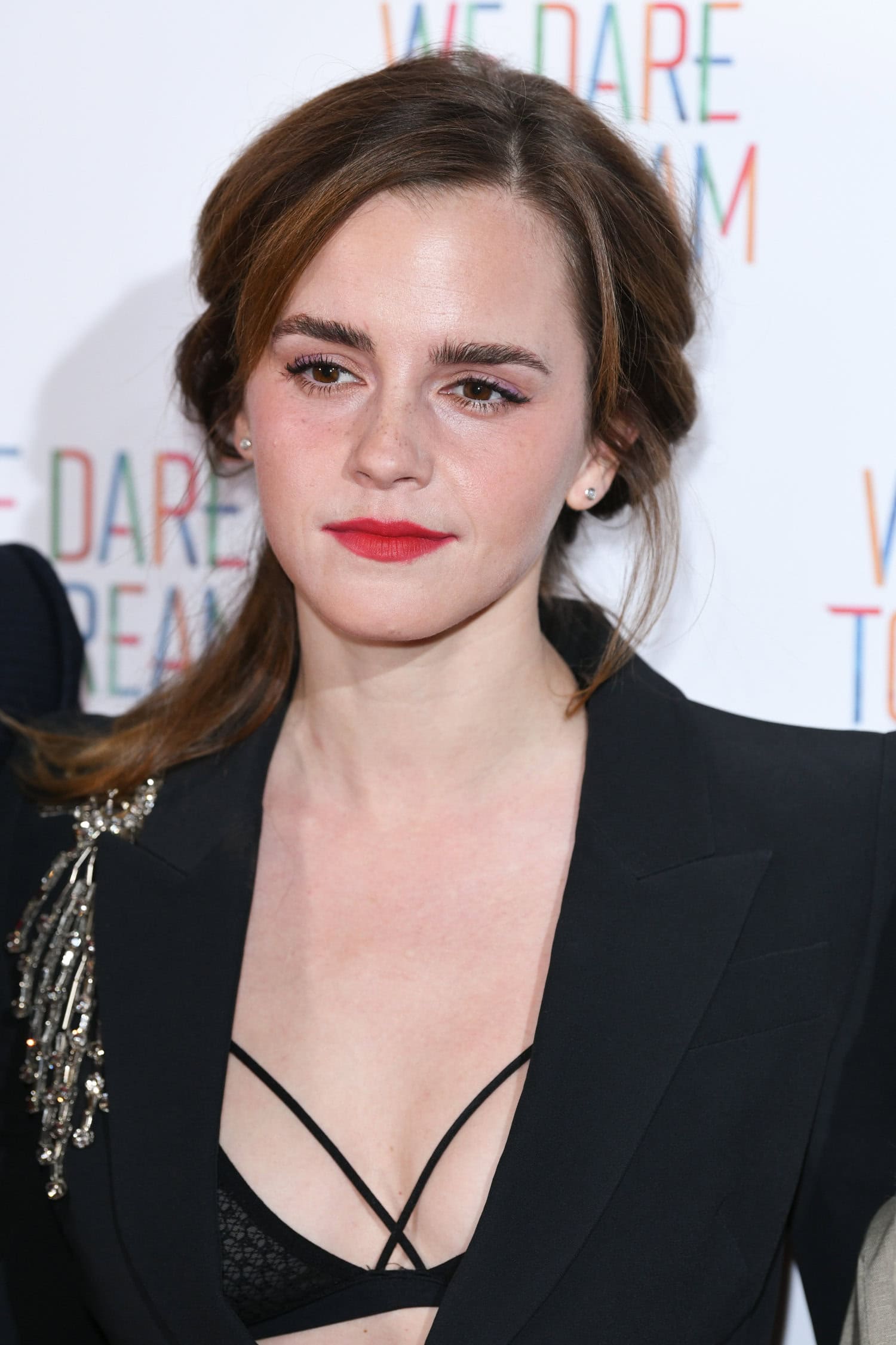 Paidan sijaan Watson oli valinnut jakun alle näyttävät rintaliivit, jotka näkyivät tyylikkäästi kiinni napitetun takin alta. Kokonaisuden kruunasivat kuulas meikki sekä punaiset huulet.