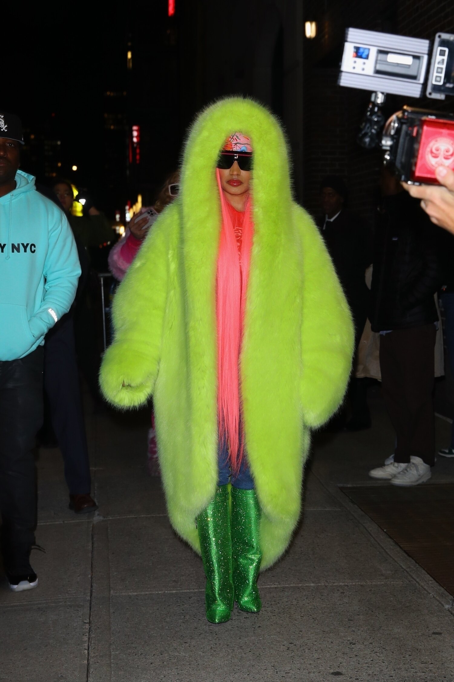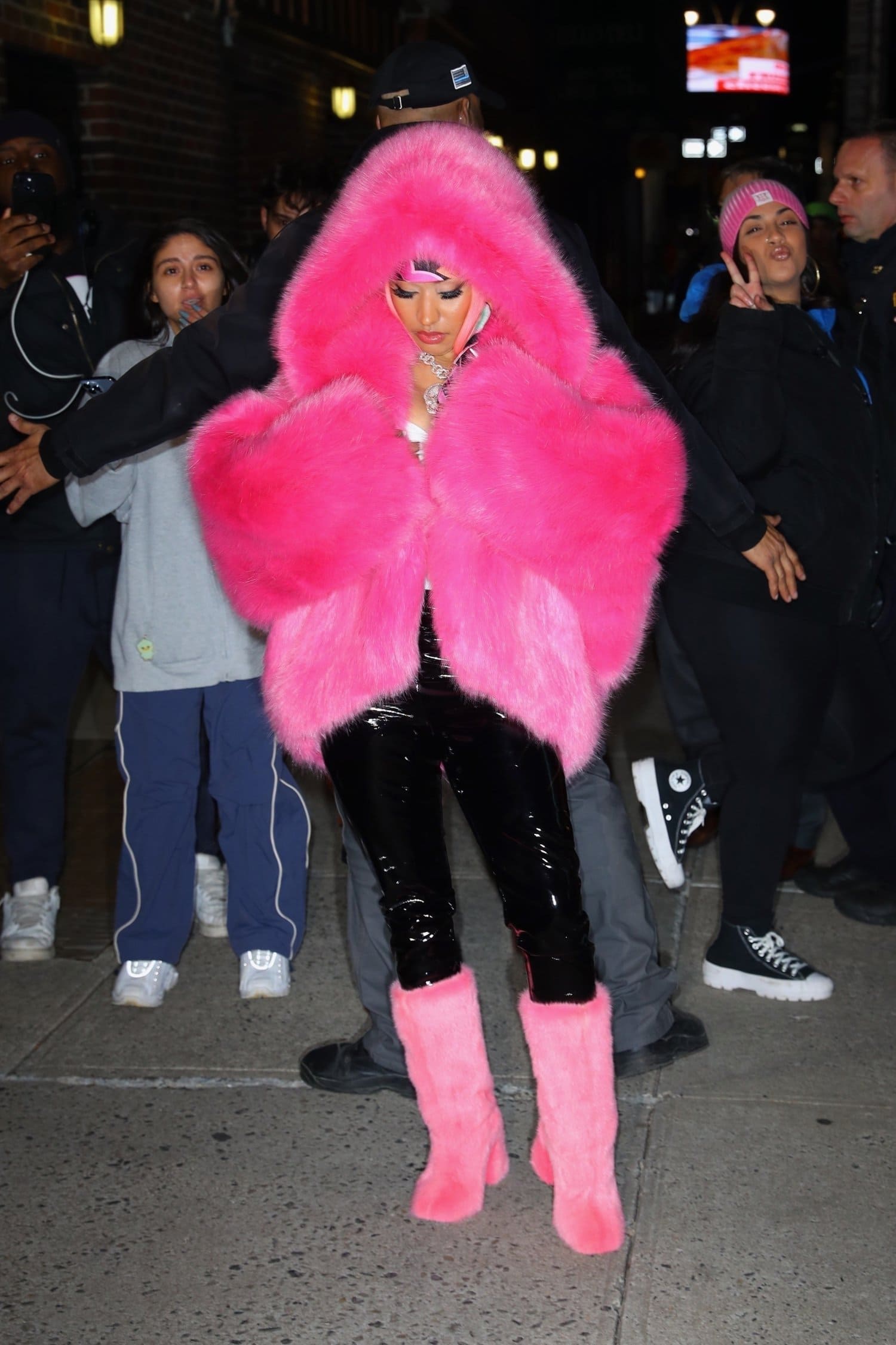 Seuraavaksi Minaj asteli kameroiden eteen lookissa, jonka pääosassa oli pinkki väri. Asu koostui näyttävästä Alexandre Vauthierin karvatakista, mustista lateksi housuista sekä Duckie Confettin karvoilla koristelluista saappaista. Sekä saappaat että takki olivat samaa väriä, mutta kivaa kontrastia toivat mustat housut.