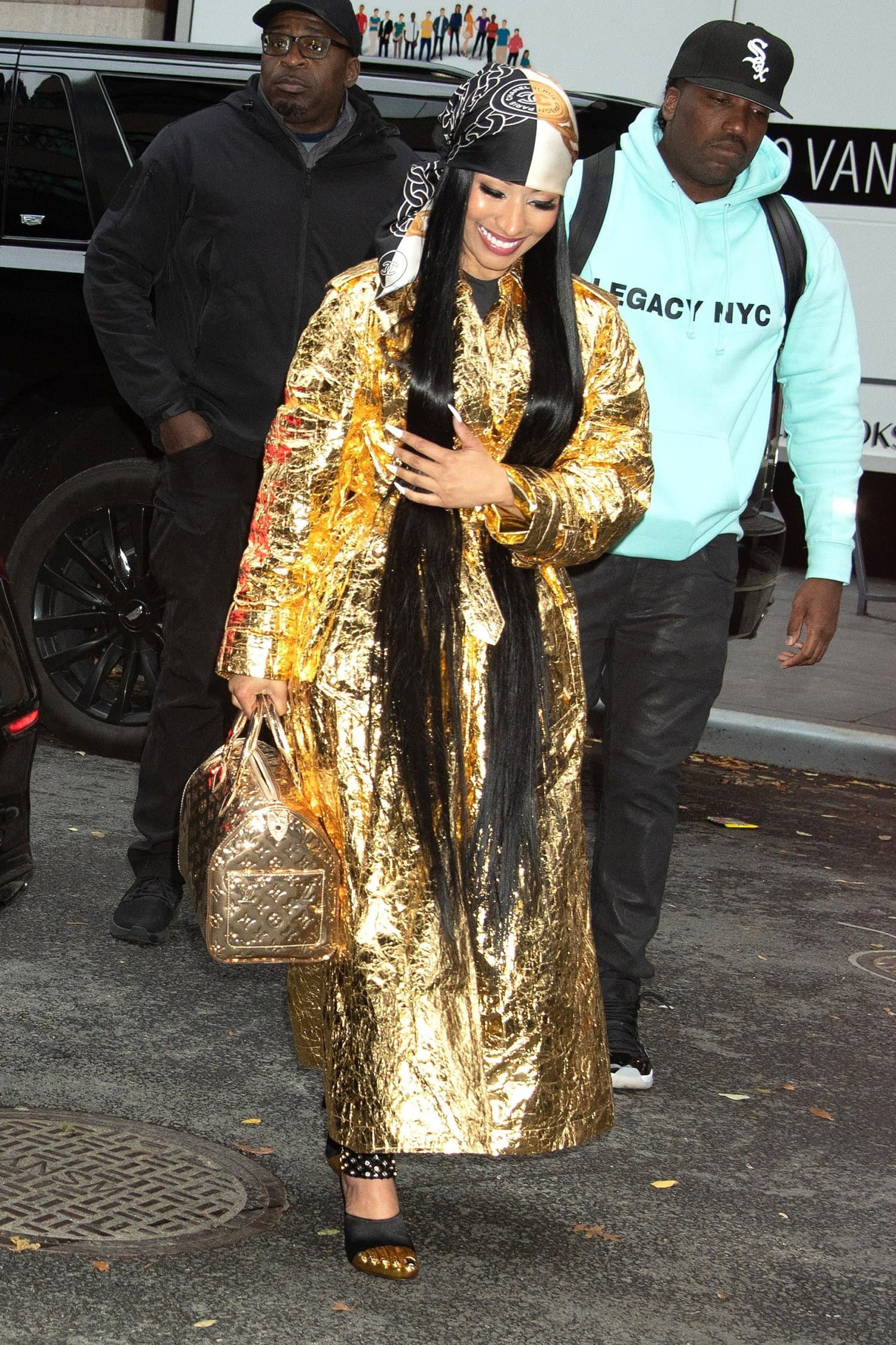 Ensimmäiseksi kuluvan viikon maanantaina Minaj ikuistettiin kuviin kultaisessa lookissa. Asu koostui Dolce & Gabbanan kultaisesta pitkästä trenssistä sekä Schiparellin näyttävistä korkokengistä. Takin alla oleva asu ei päässyt kuvissa vilahtamaan, mutta kokonaisuuden kruunasi näyttävä Chanelin huivi.