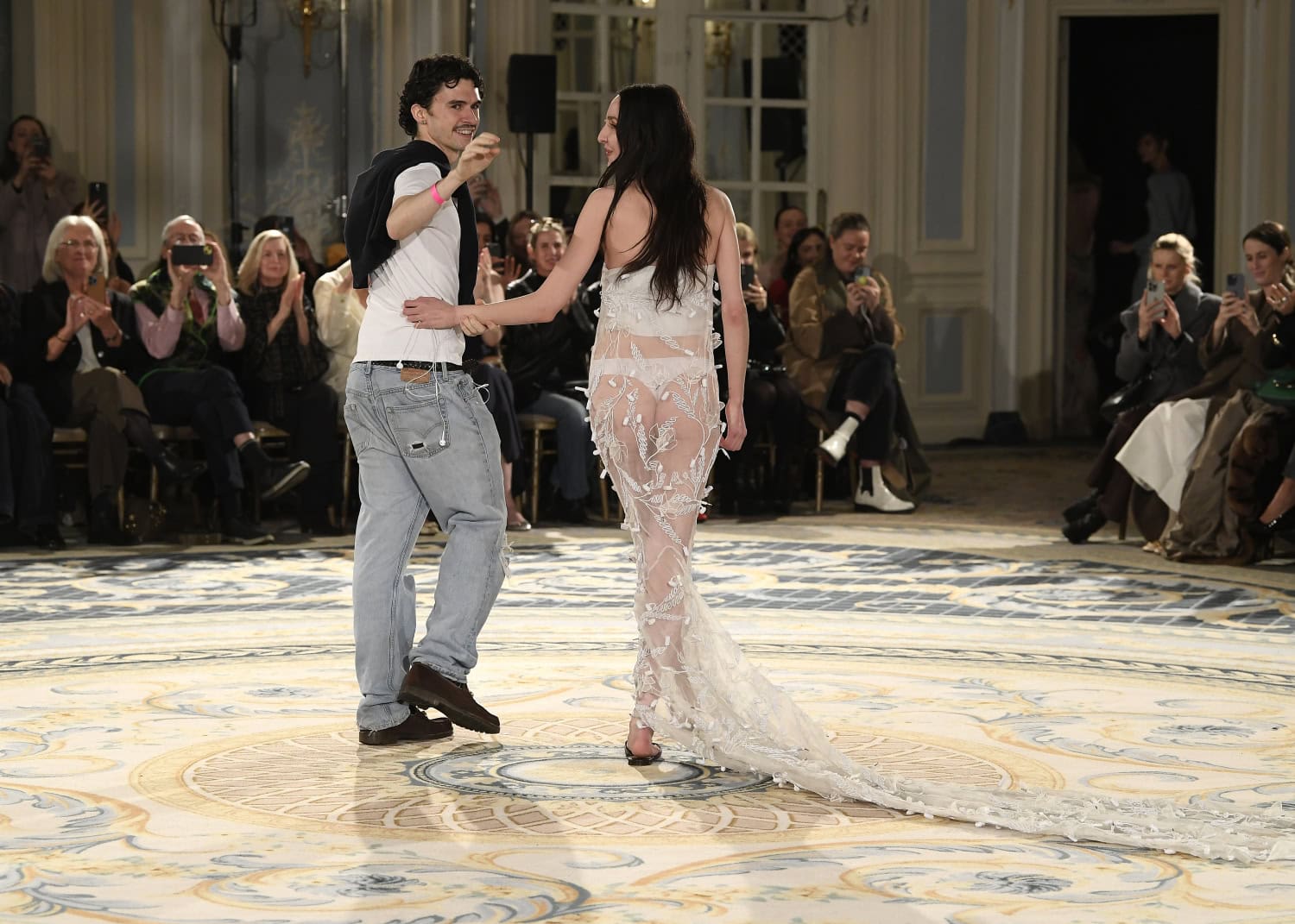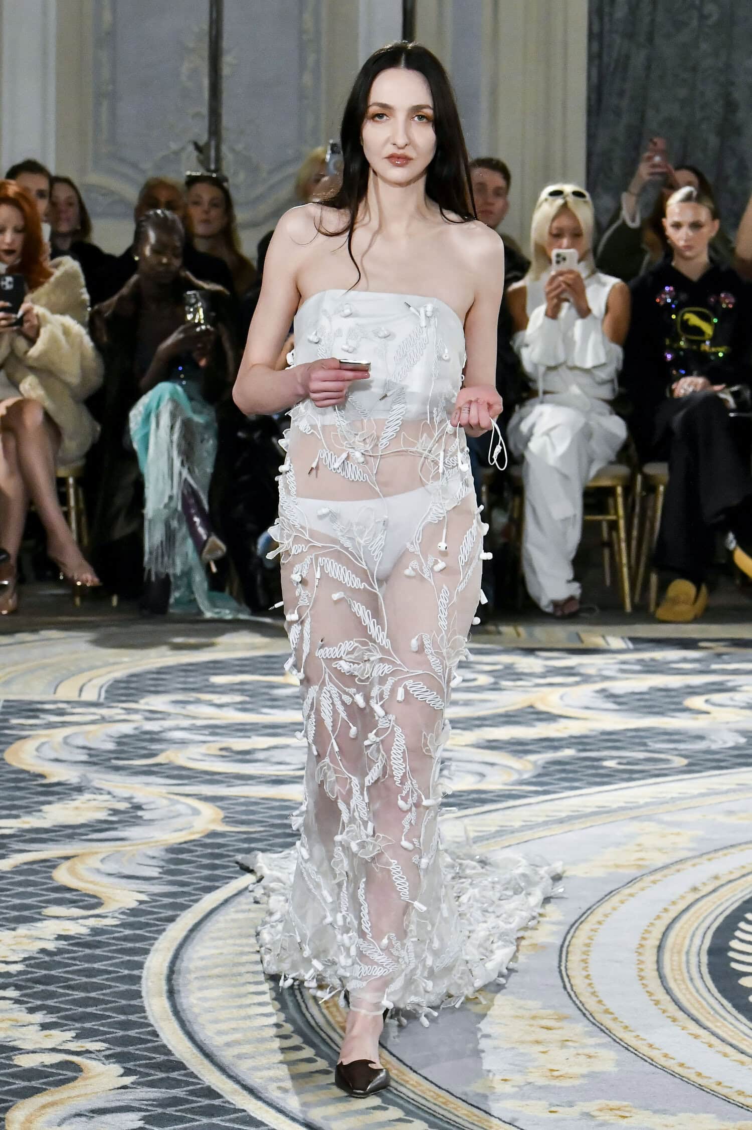 Muotibrändi Conner Ives marssitti näytöslavalle erikoisen hääpuvun. Mekon väri oli tyypillisesti valkoinen, mutta sen läpinäkyvä kangas paljasti mallin alushousut.