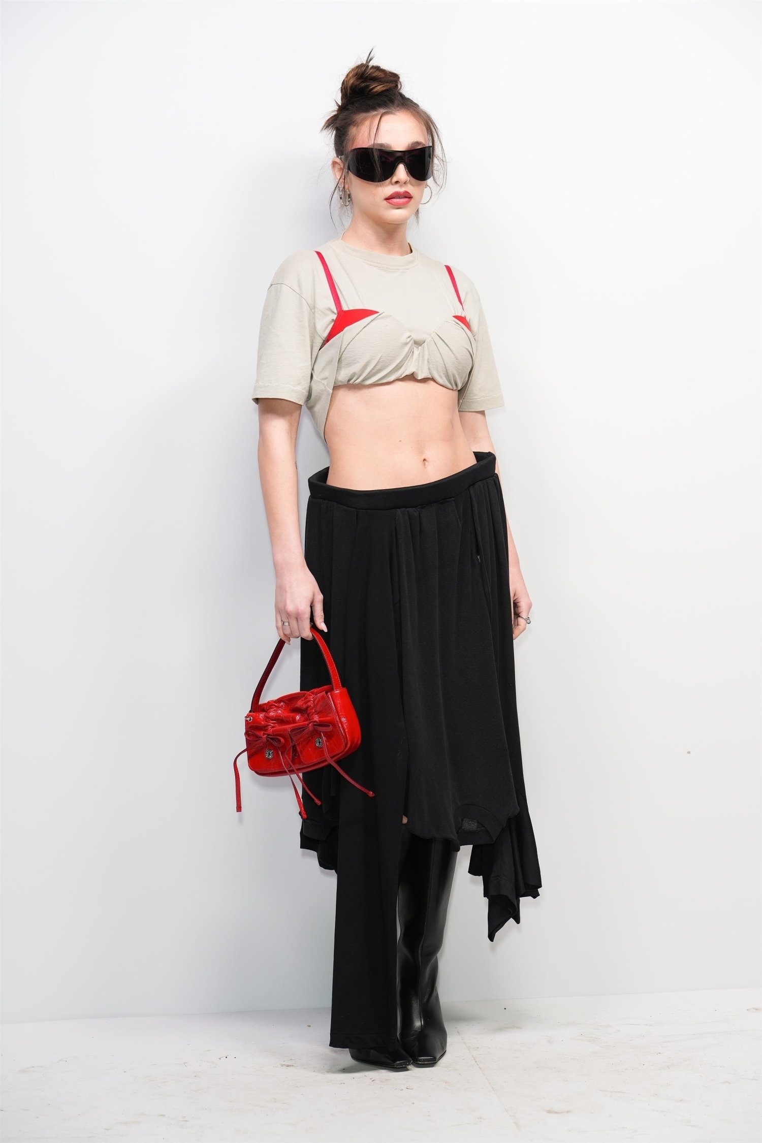 Lopputuloksena on näyttävä ja erilainen crop top, joka toi lookiin myös lisäripauksen muodikasta punaista, joka olin myös Chamberlainen pikkulaukun väri.
