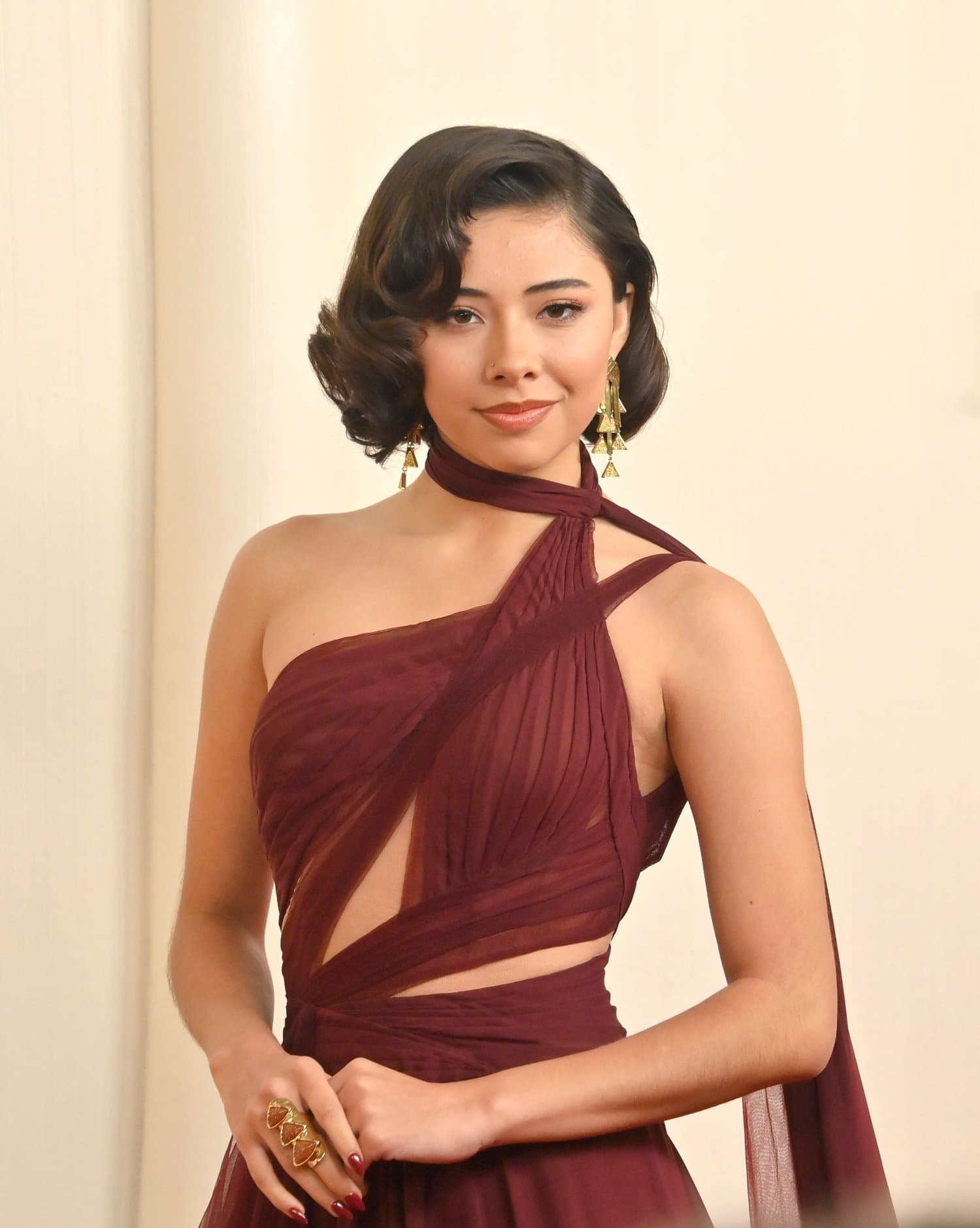 Näyttelijä Xochitl Gomez poseerasi punaisella matolla tummanpunainen mekko yllään. Yläosan vedoksellisuus loi vaikuttavan kokonaisuuden. Kultaiset korvakorut kruunasivat kokonaisuuden.