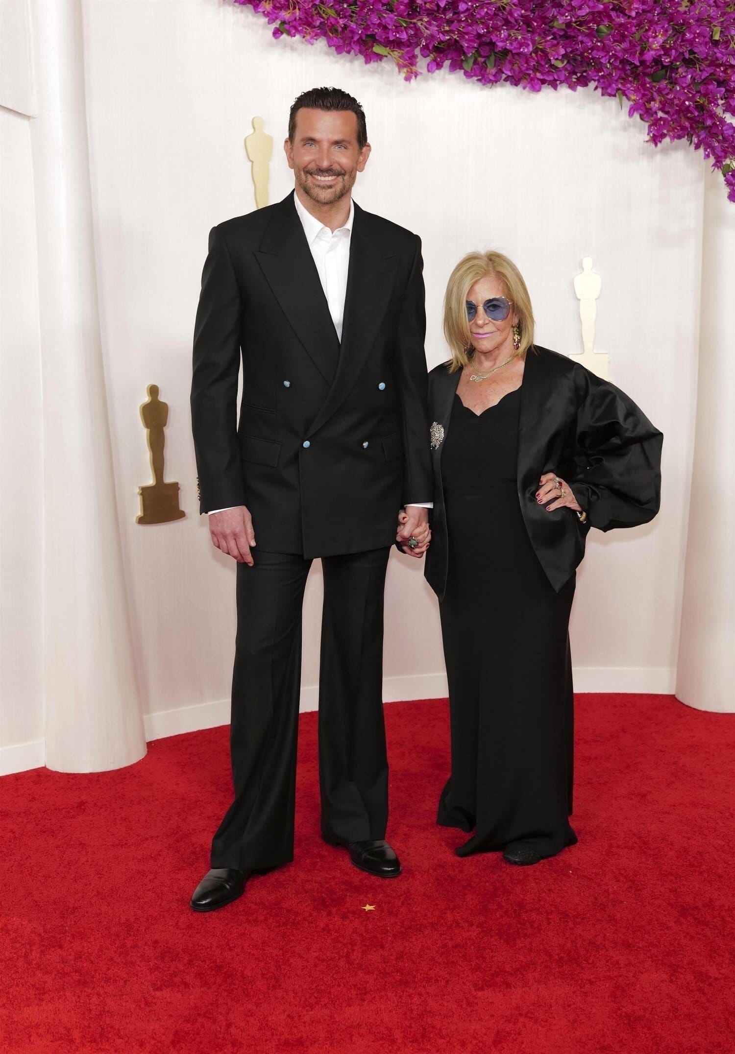 Näyttelijä Bradley Cooper edusti punaisella matolla äitinsä Gloria Campanon kanssa. Cooper oli valinnut ylleen mustan kaksirivisen puvuntakin. Puvun leveät käänteet toivat kokonaisuuteen skarpin vaikutelman.