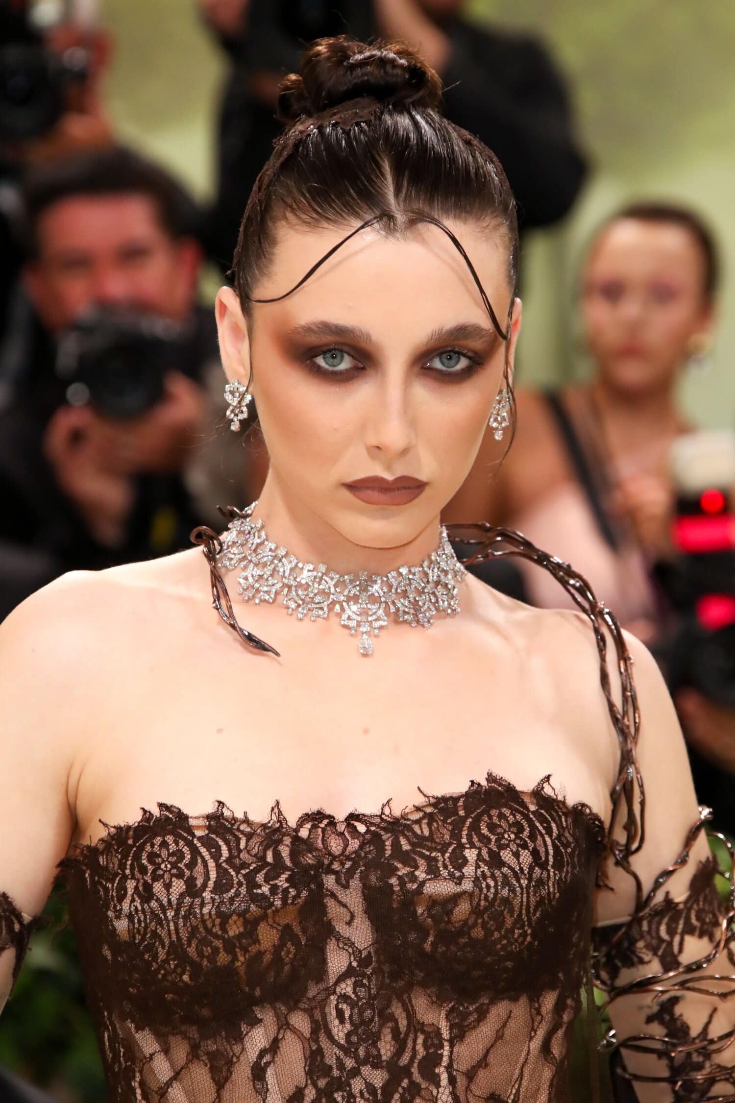 Emma Chamberlainin silmämeikki oli valittu sävy sävyyn hänen iltapukunsa kanssa. Ruskean sävyinen meikki korosti upeasti Chamberlainin silmiä ja sai aikaan näyttävän lopputuloksen. Myös nudensävyinen huulipuna oli nappivalinta tähän lookiin.