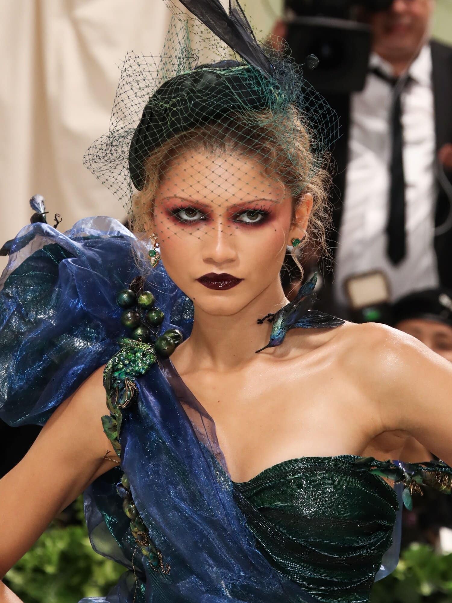 Zendayan look oli yksi illan dramaattisimmista. Hänen tumman violetti silmämeikkinsä sai lisää dramaattisuutta tummista rajauksista, ohuista kulmakarvoista sekä syvän violetista huulipunasta.