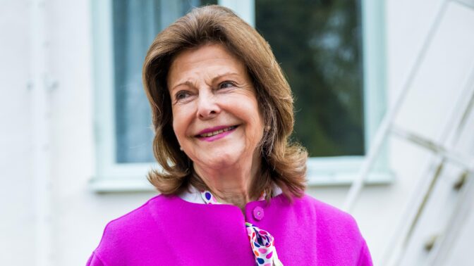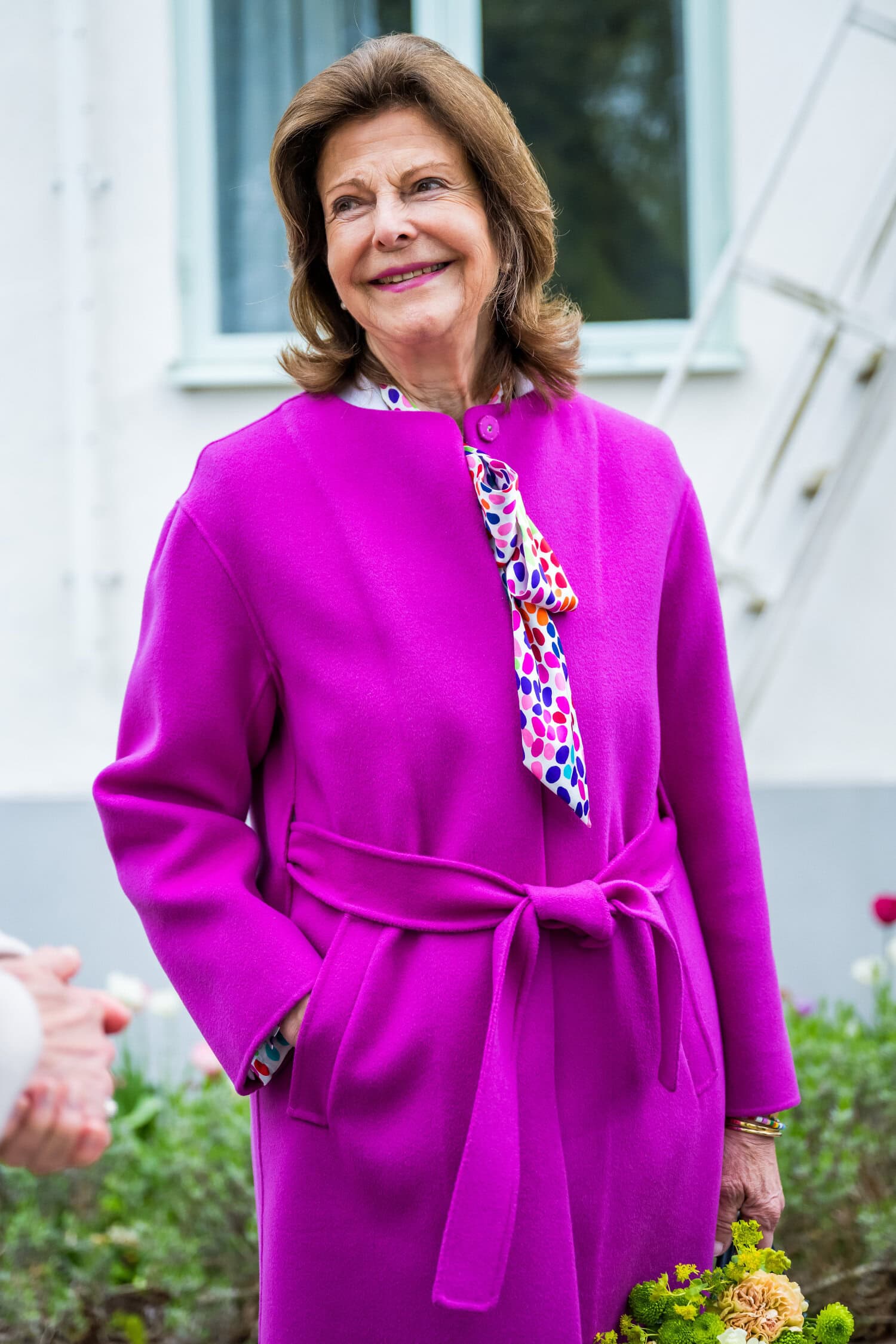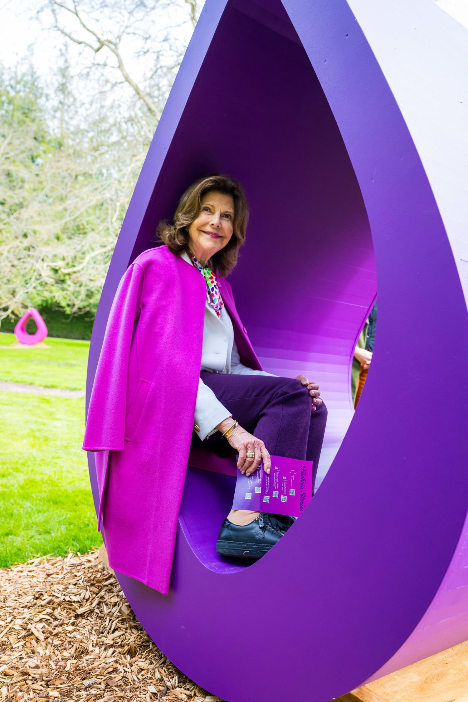 Kuningatar Silvia oli pukeutunut kirkkaana hohtavaan violettiin takkiin sekä tummempiin violetteihin housuihin. Hänen värimaailma sointuikin täydellisesti näyttelyn töiden kanssa kuten alla olevasta kuvasta näkee.